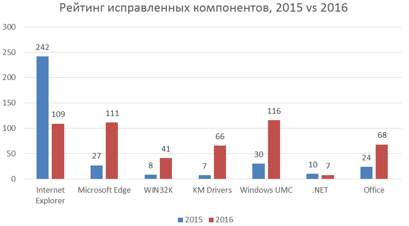 В начале 2016 года Microsoft свернула поддержку старых версий Internet Explorer, что не могло не отразиться на статистике. Всего в IE нашли 109 уязвимостей, в два раза меньше, чем годом ранее. Еще 111 уязвимостей компания закрыла в стандартном браузере Windows 10 — Microsoft Edge, зато ни одна из них не использовалась в кибератаках до выпуска исправлений.