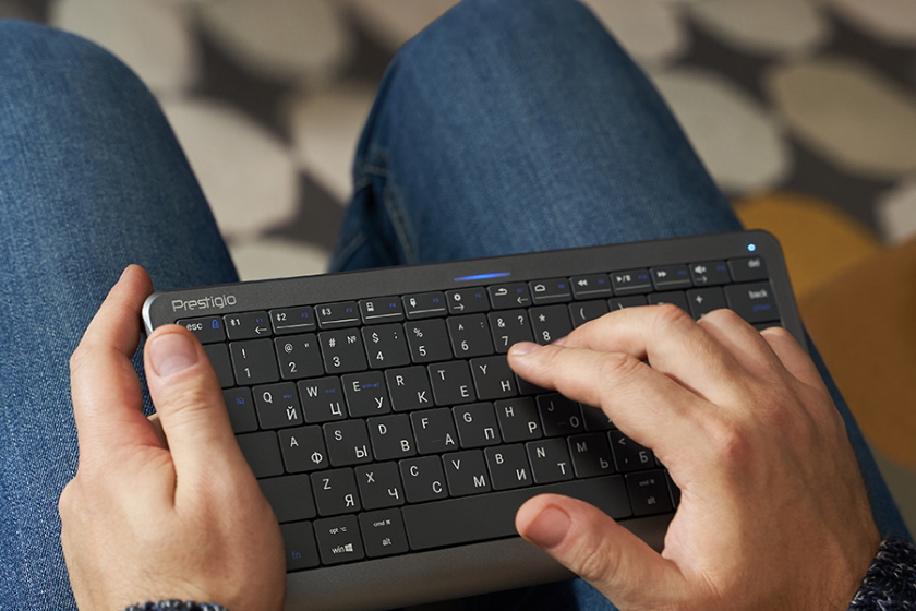 Prestigio Click&Touch ещё может похвастаться функцией «умного переключения». Она определяет в каком режиме работает пользователь и сама переключается между клавиатурой и тачпадом. Устройство подключается по Bluetooth или через порт USB-C. Работает клавиатура не только с ПК, но и с «умными» телевизорами, интерактивными панелями и т.д.