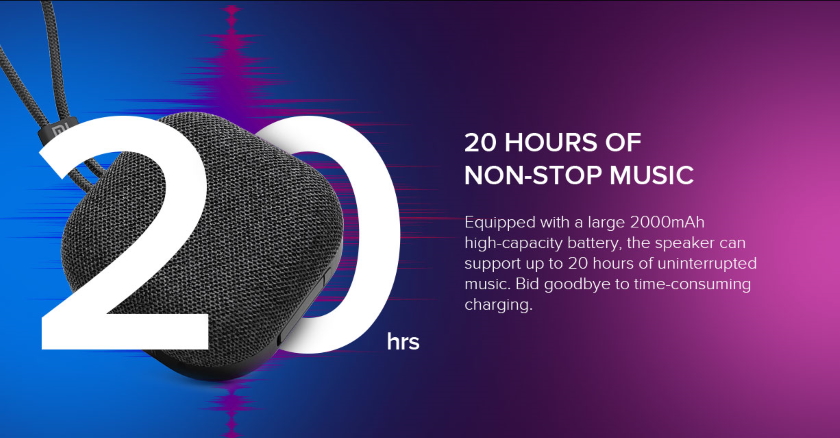 Новинка получила прорезиненный пластиковый корпус с защитой IPX5, Bluetooth 5.0, две кнопки управления и аккумулятор на 2000 мАч. Его должно хватить на 20 часов прослушивания музыки. Если говорить про звук, то за него отвечают 5-ваттные динамики.