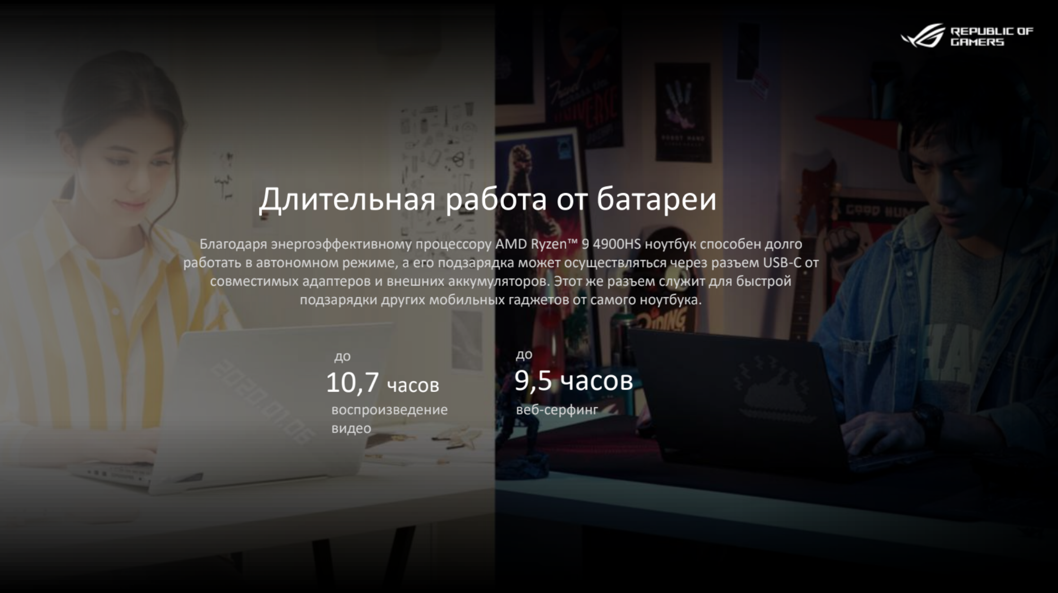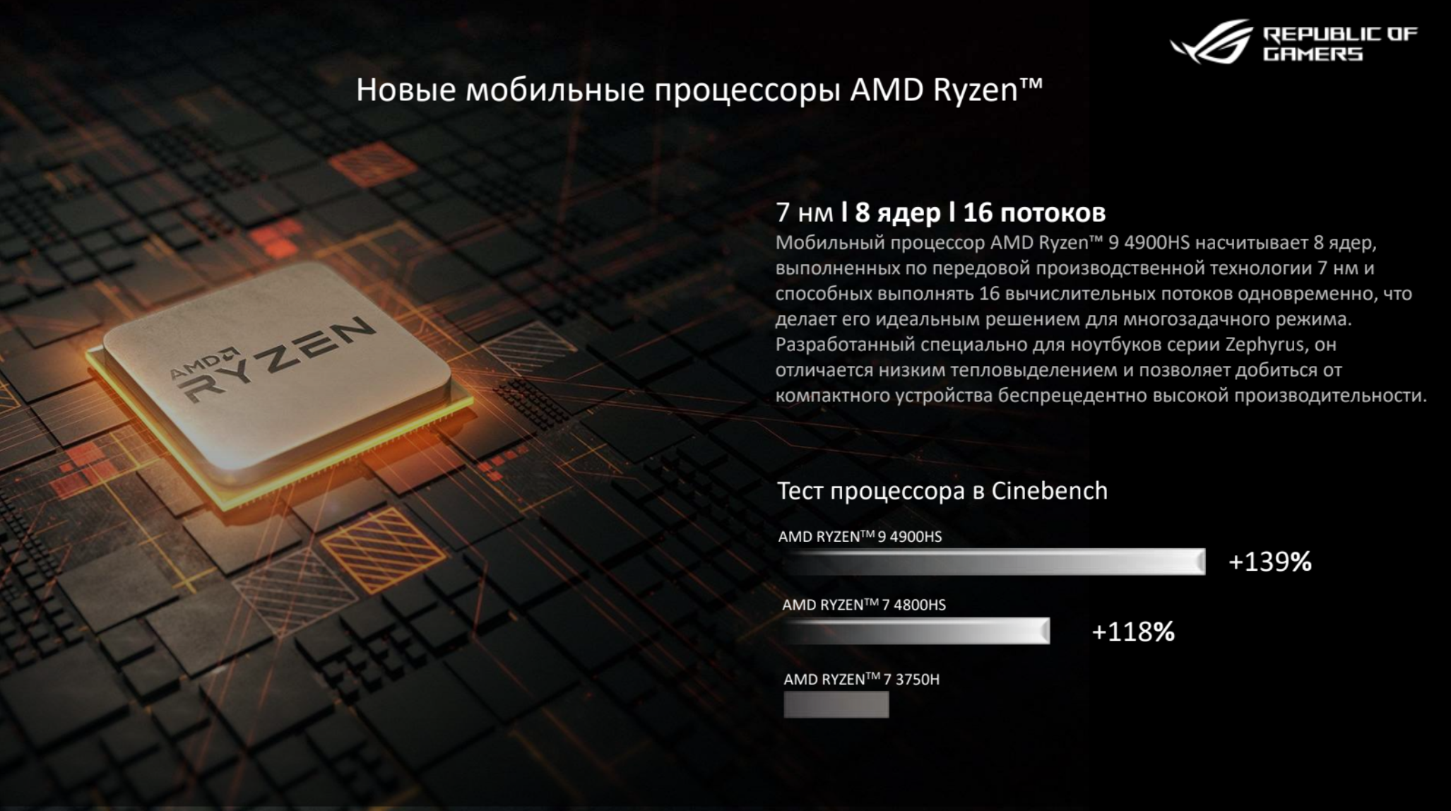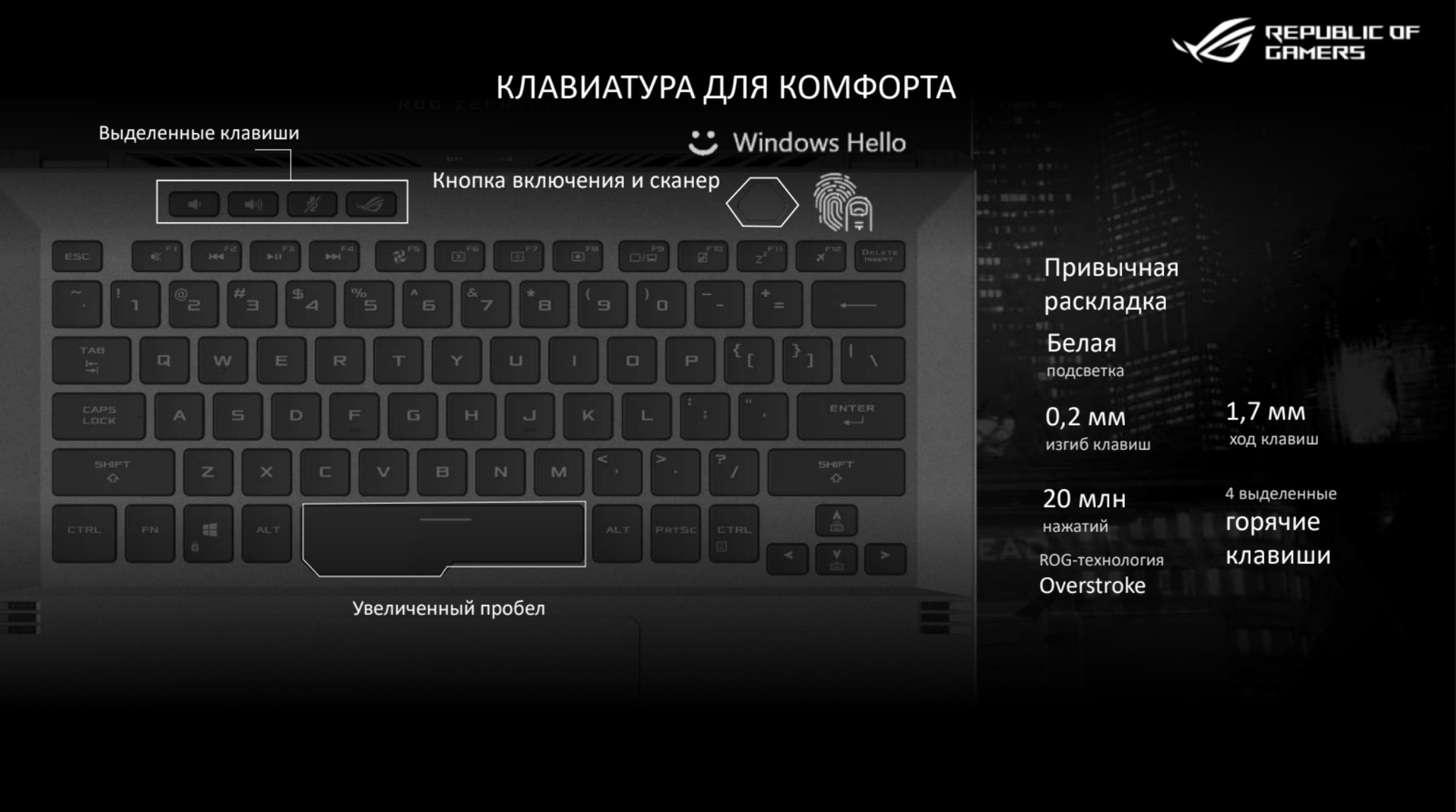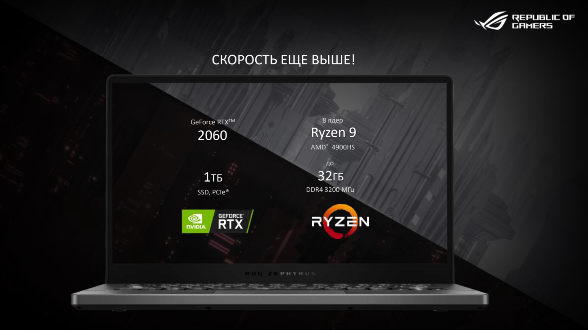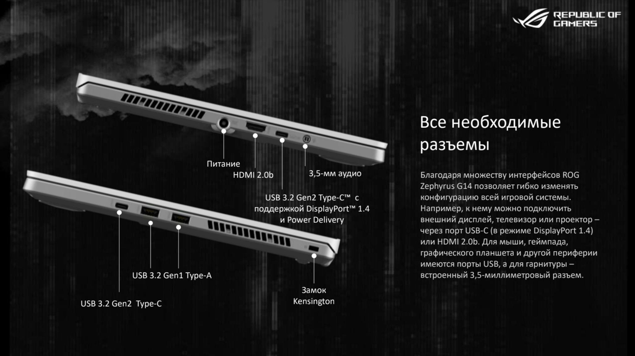 Питается ASUS Zephyrus G14 от аккумулятора, которого хватит до 9.5 часов серфинга в интернете и до 10.7 часов во время просмотра видео. Заряжается батарея через порт USB-C. За производительность устройства отвечает 7-нанометровый процессор Ryzen 9 с 8 ядрами. Он поставляется в паре с видеокартой GeForce RTX 2060, ОЗУ до 32 ГБ и системой охлаждения. SSD в ноутбуке может быть до 1 ТБ. Ещё в новинке стоит отметить привычную клавиатуру, сканер отпечатков пальцев, который срабатывает за 0.1 секунды, стереодинамики и множество разных портов. Продажи ASUS Zephyrus G14 стартуют в июне с ценником от 31 099 грн.