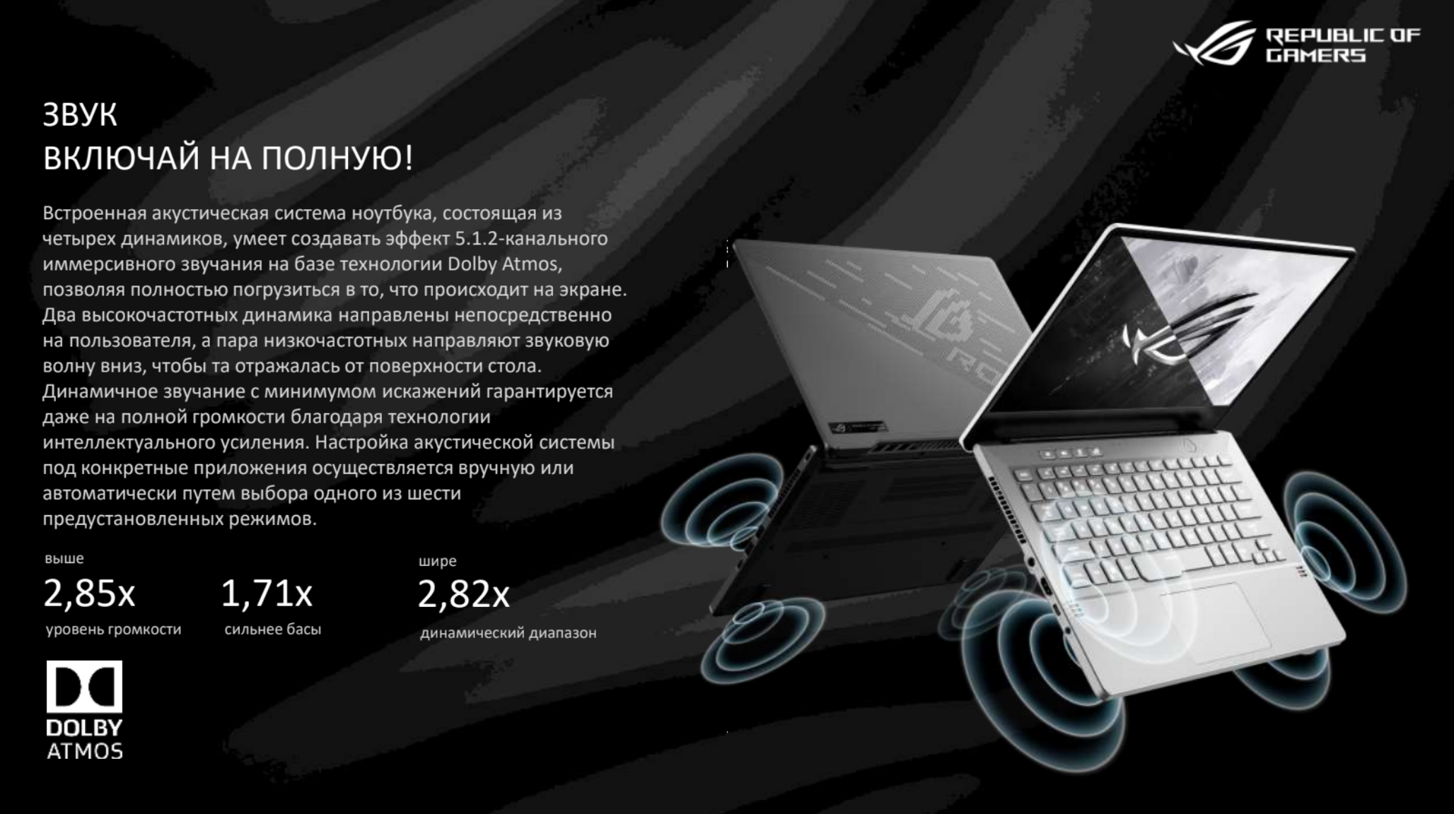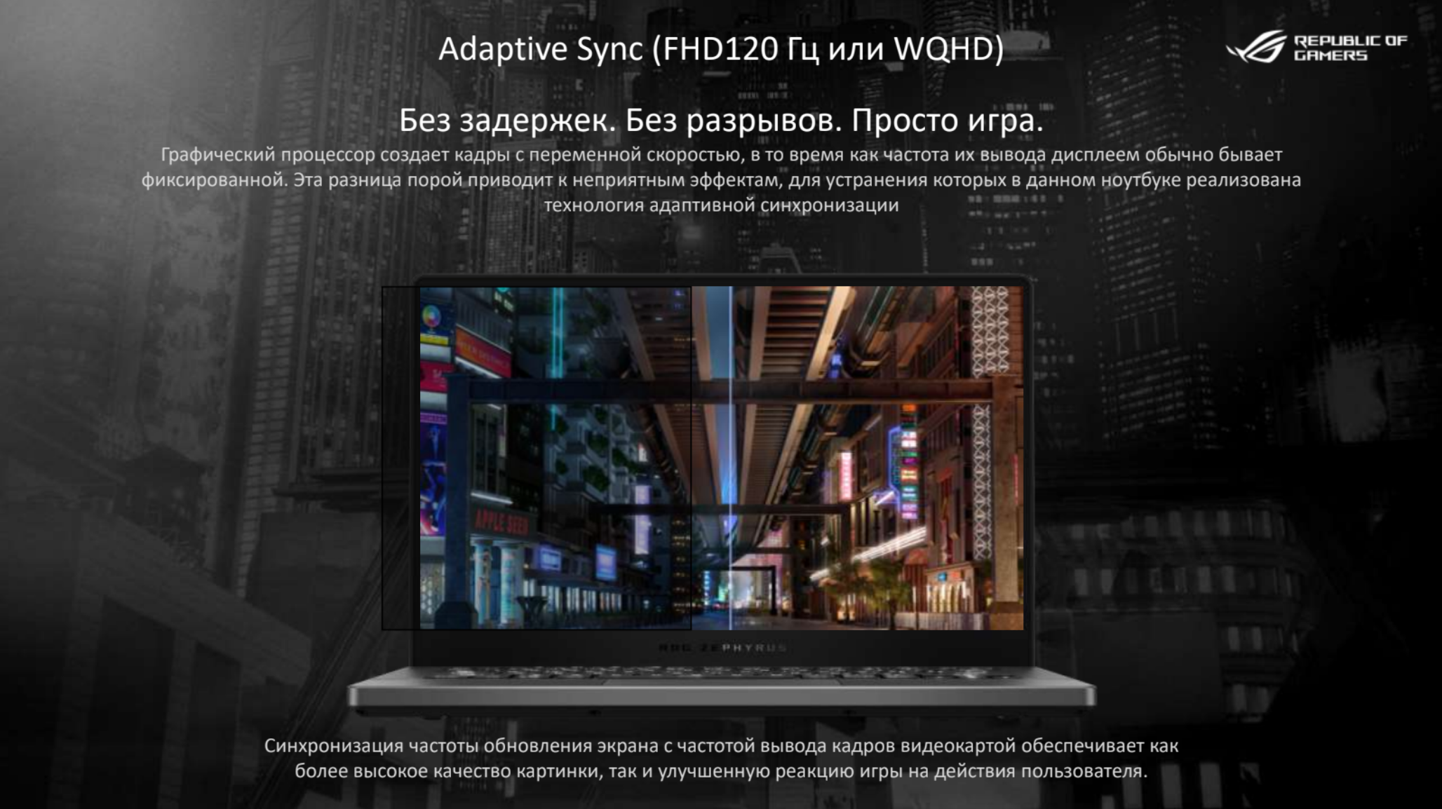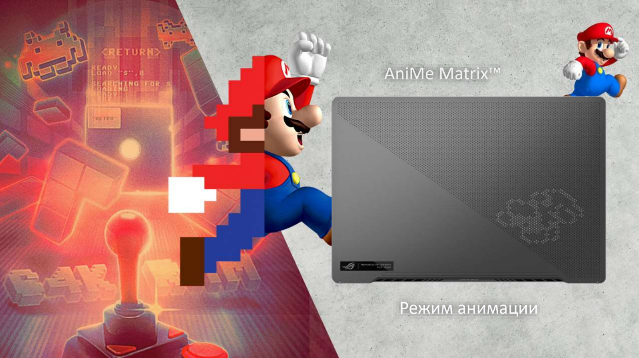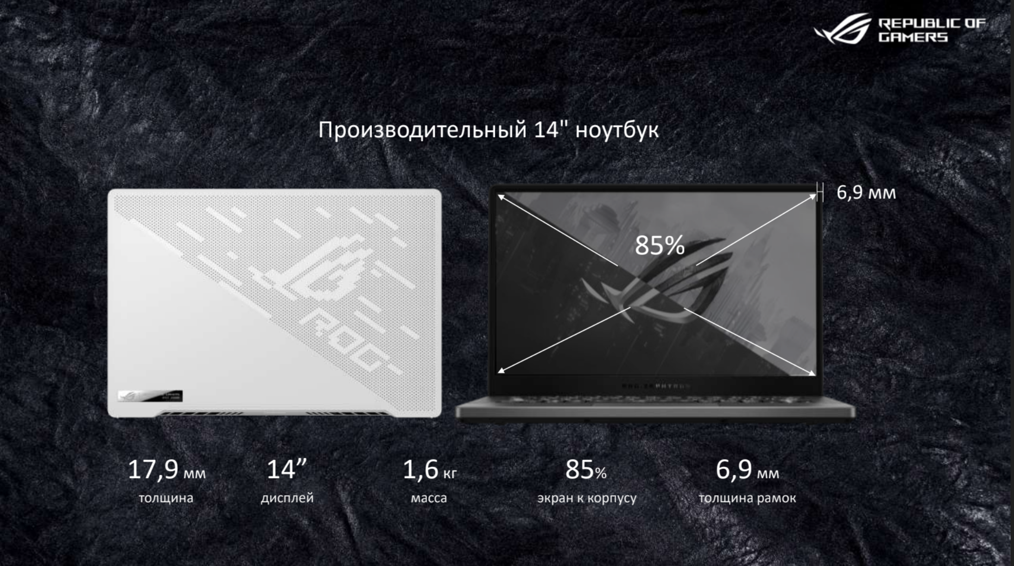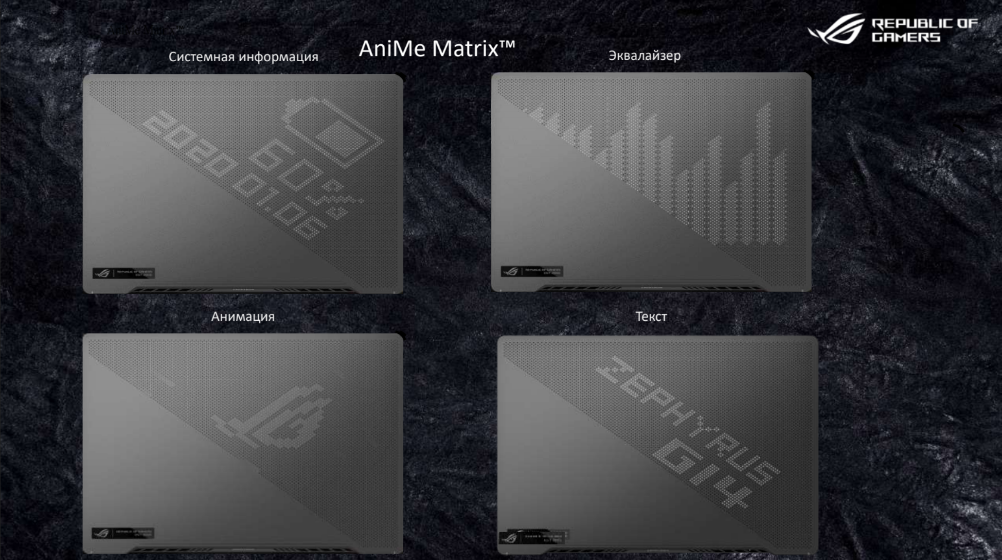 Эта модель может похвастаться компактными габаритами и мощной начинкой. Ноутбук получил 14-дюймовый дисплей с разрешением до WQHD и частотой 120 Гц, тонкие рамки, корпус с толщиной 17.9 мм и технологию AniMe Matrix с 1215 миниатюрными светодиодами. Они выводят пиксельные картинки на крышку ноутбука.