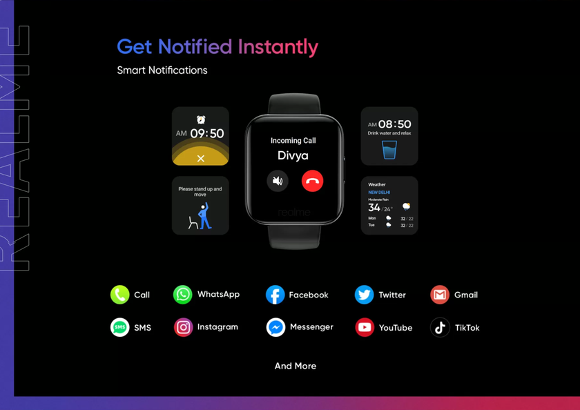 Новинка внешне похожа на смесь Apple Watch и Fitbit Versa. Часы оснастили цветным 1.4-дюймовым сенсорным дисплеем с разрешением 320×320 пикселей, 2.5D-стеклом Gorilla Glass 3 и максимальной яркостью 380 нит. Корпус Realme Watch защищён от воды по стандарту IP68. Они получили датчик сердцебиения, SpO2, 12 встроенных циферблатов и более 100 циферблатов в приложении Realme Link.