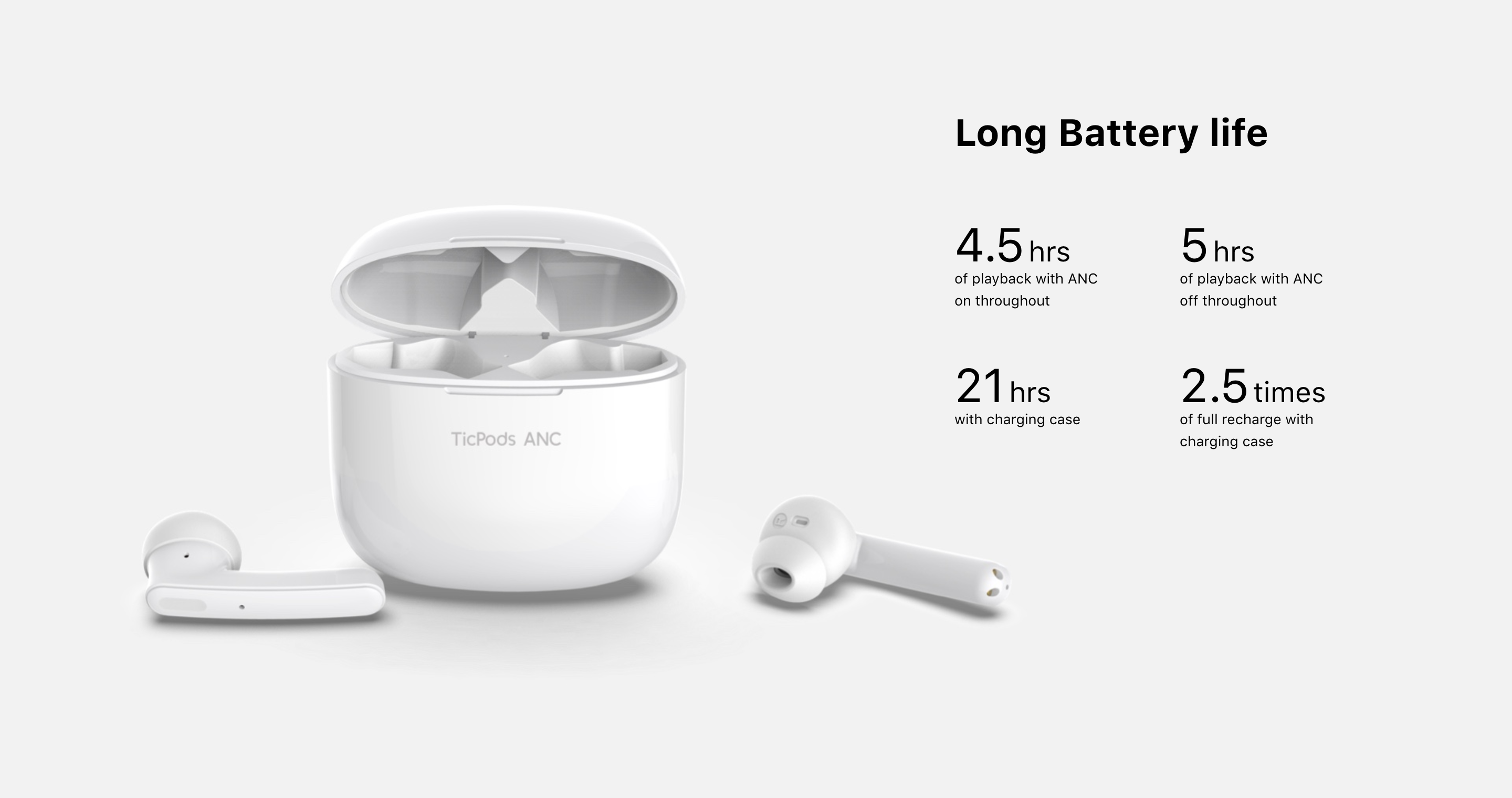 TicPods ANC также получили 13-миллиметровые драйверы, защиту IPX5, сенсорное управление, несколько микрофонов, встроенные аккумуляторы с автономностью до 5 часов (4.5 ч с включённым ANC) и кейс, который продлит время работы до 21 ч. Заряжается чехол через порт USB-C. Беспроводной зарядки у него, к сожалению, нет.