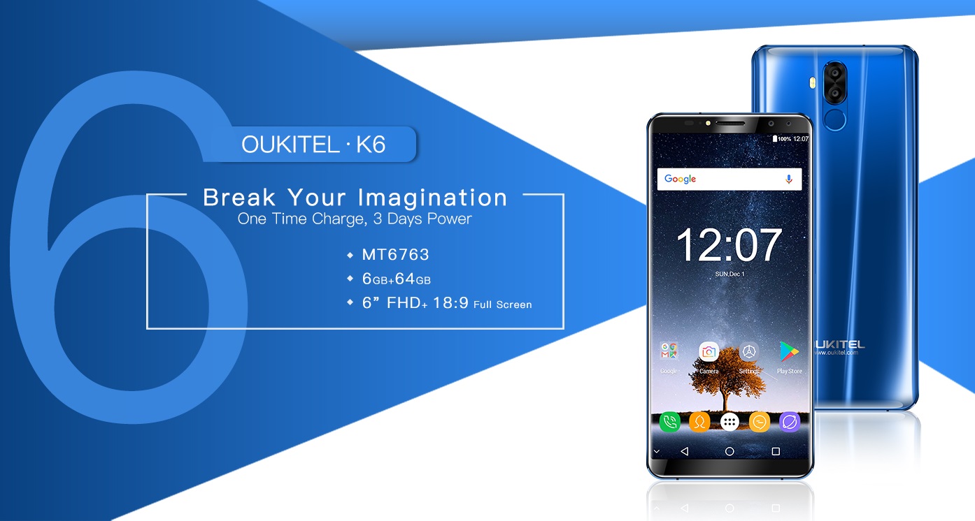 Компания OUKITEL запускает мировую продажу смартфона OUKITEL K6. Новинка получила 6-дюймовый полноэкранный дизайн с соотношением сторон 18:9, процессором Helio P23, 6 ГБ ОЗУ и батареей на 6300 мАч.