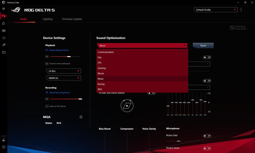 Теперь поговорим про Hi-Res, MQA, качество звука при воспроизведении музыки и вот это вот всё. ASUS ROG Delta S соответствует сертификации Hi-Res и аппаратно умеет декодировать кодек MQA. В двух словах что это такое. MQA (Master Quality Authenticated) — аудиокодек, который был разработан в 2014 году компанией Meridian Audio. Суть в том, что MQA использует сжатие с потерями, но после "распаковки" получается материал без потери качества. В первую очередь, MQA предназначен для потокового аудио: пользователю можно предоставить высокое качество звука, при этом уменьшить необходимое количество передаваемых данных. К сожалению, на данный момент предлагают MQA только TIDAL, Nugs.net и китайский Xiami. Последний, к слову, прекращает свою работу с 5 февраля. В файловом виде MQA пакуется в контейнеры типа FLAC. Насколько важна поддержка MQA в игровой гарнитуре — сказать сложно. Лишней не будет, но реальная польза будет если помимо TIDAL, Nugs.net стандарт начнут поддерживать и другие платформы.