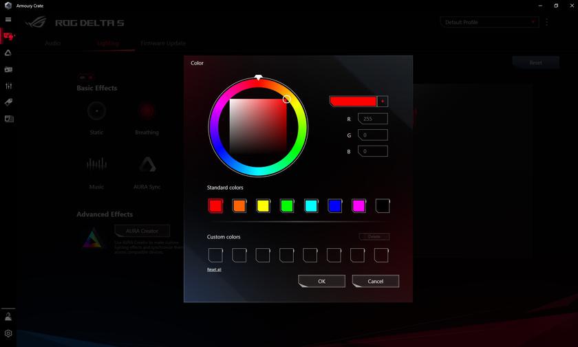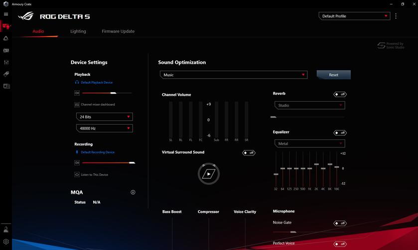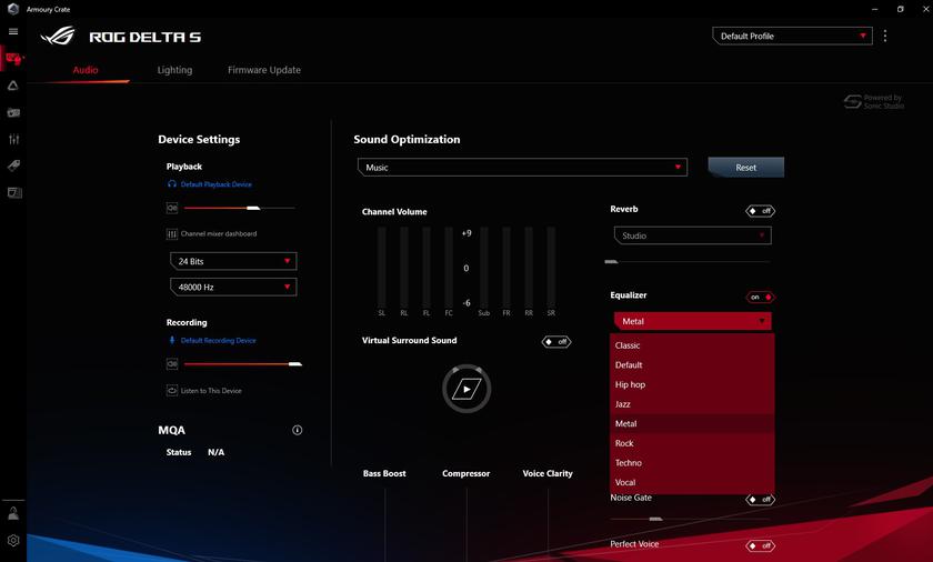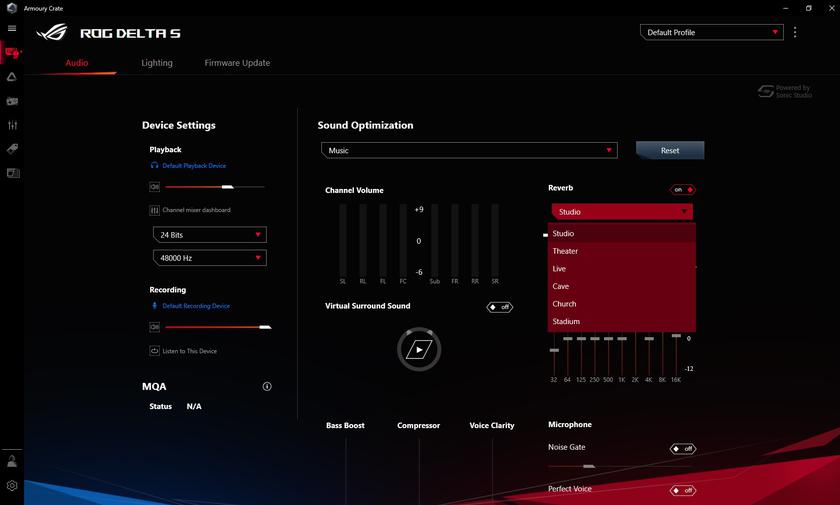 В ASUS ROG Delta S используются 50-миллиметровые динамические излучатели ASUS Essence с герметичными акустическими камерами и SoC ESS Sabre 9281 с четырьмя ЦАПами. Каждый из них предназначен для отдельной части диапазона частот: низкие, средние, высокие и ультравысокие. Соотношением сигнал/шум – 130 дБ. В целом, звук у гарнитуры очень добротный, особенно если дело касается игр и фильмов. Несмотря на общую нейтральность без существенных перегибов или провалов в отдельных частях диапазона, все спецэффекты звучат очень убедительно, масштабно и сочно. Позиционирование источников звука также достаточно точное. При желании можно ещё "поиграться" с виртуальным объёмным звуком. Включается и настраивается в фирменном ПО. Да, разумеется, это — не полноценная многокалнальная аудиосистема или многодрайверная игровая гарнитура, но получается довольно правдоподобно.