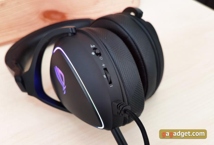 Крепление кабеля, как и все имеющиеся управляющие элементы расположены на нижнем наушнике. Их всего два: трёхпозиционный регулятор громкости (он же при нажатии выключает микрофон) и трёхпозиционный ползунок для выбора режима подсветки. Её можно просто выключить, использовать привычную RGB AURA, либо включить эффект "звуковая волна". В последнем случае подсветка будет мигать синхронно с голосом пользователя.