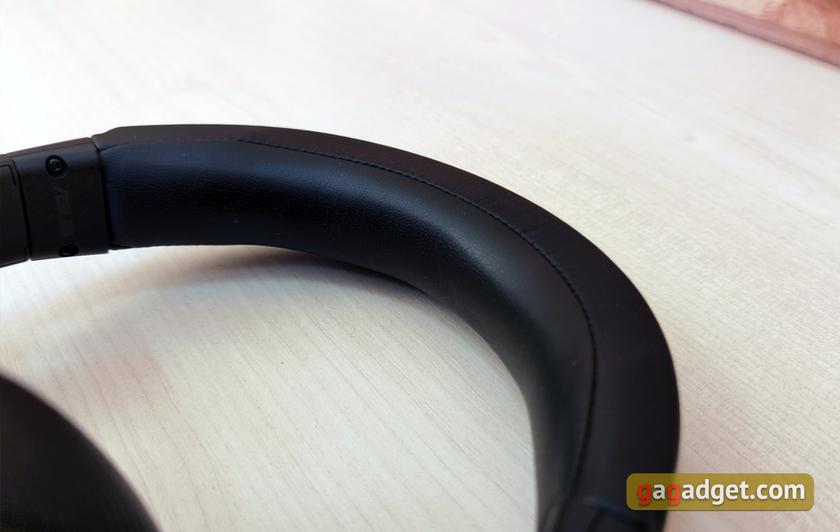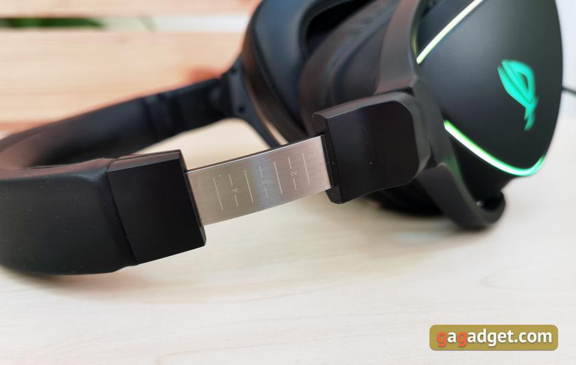 Оголовье имеет привычную раздвижную конструкцию регулировки размера. Каркас металлический, а обивка сделана из искусственной кожи с мягким наполнителем. На внешней части — тиснение Republic of Gamers.