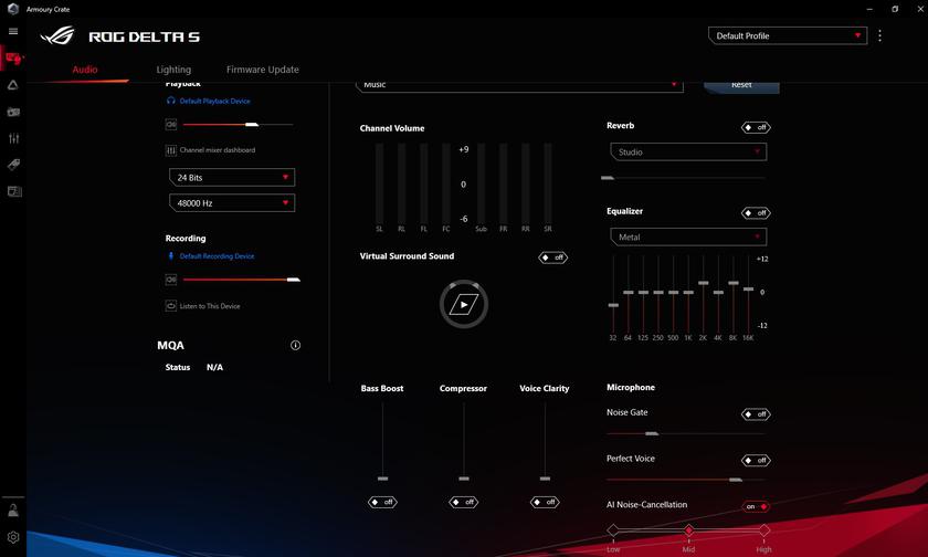 Для настройки используется общее для всей игровой периферии производителя ПО Armoury Crate. Есть регулировка громкости и эквалайзера, виртуальный объёмный звук, настройка шумодава, компрессия, усиление басов, голоса, реверберация и настройки подсветки. Плюс есть пресеты для разных сценариев использования (музыка, фильмы, игры и тд).