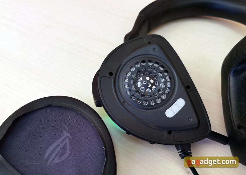 Амбушюры также имеют D-образную форму, внутри — ткань с логотипами ROG. Они также обиты исусственной кожей, по периметру есть декоративное тиснение в виде диагональных полос. Внутри — мягкий пенный наполнитель. Сменные комплектные амбушюры обиты дышащей тканью ROG Hybrid. В них звукоизоляция хуже, но не будет жарко летом.