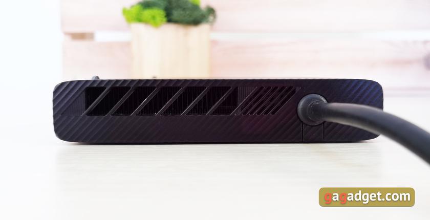 На торцах тоже хватает интересного. Со стороны входа кабеля размещены вентиляционные отверстия для выдува горячего воздуха. На верхнем торце — ещё вентиляционные отверстия и слот для карт памяти SD, поддерживается UHS-II (312 МБ/с). Второй боковой торец занят всеми остальными разъёмами, а их достаточно: HDMI 2.0, DisplayPort 1.4, RJ-45 (Gigabit Lan 10/100/1000 Mbps), 4xUSB 3.2 Gen1 и гнездо для подключения силового кабеля.