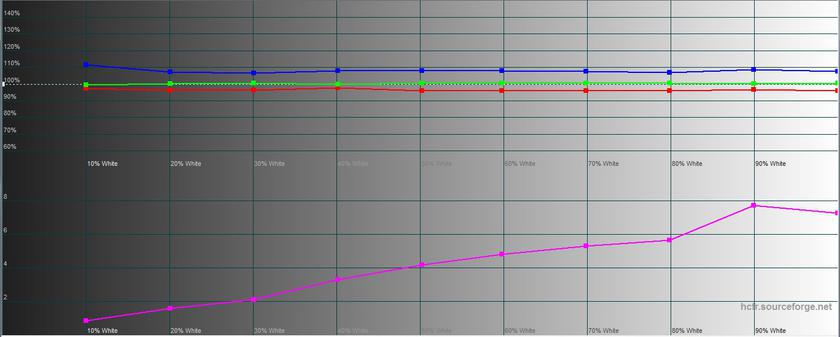 Экран оказался действительно очень толковым. Максимальная яркость составила 283.994 кд/м2, яркость черного поля — 0.242 кд/м2 и контрастность 1174:1. Калибровка очень порадовала: цветовой охват действительно практически совпадает с sRGB, а все показатели (включая цветовую температуру, цветовые составляющие) очень близки к эталонным значениям: