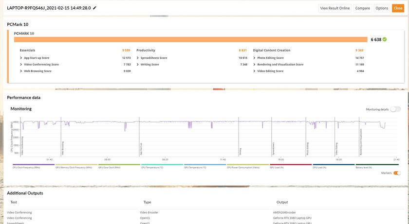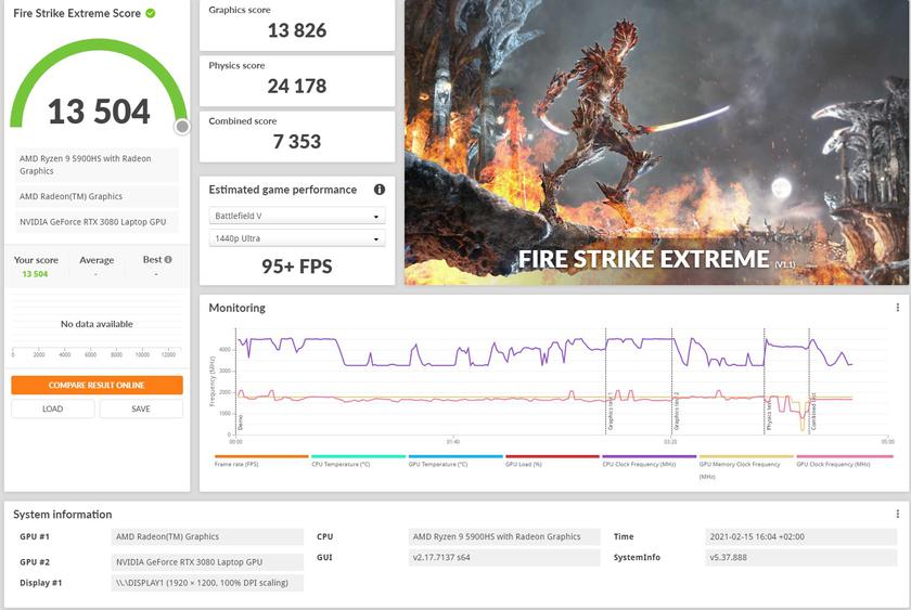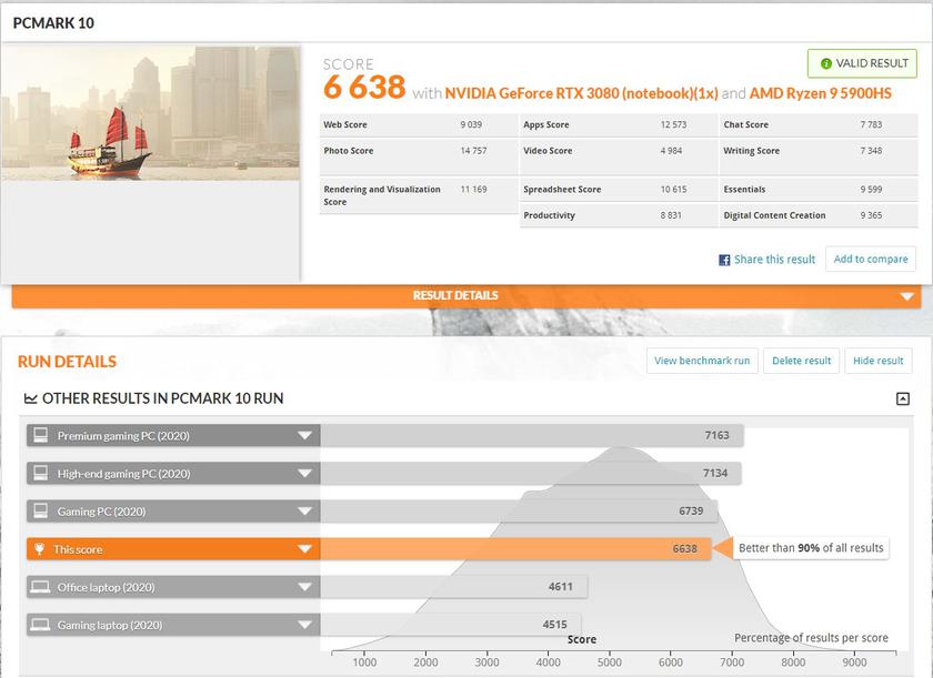 Важно: у нас на обзоре был инженерный образец (и ноутбука, и ROG XG Mobile) и это стоит учитывать. В коммерческих вариантах производитьельность в тестах, играх, да и работа систем охлаждения могут (и будут) отличаться. Тем более, что за время использования прилетело много обновлений, которые существенно влияли на работу. Несмотря на это, результаты в синтетических тестах приятно удивили. Это касается и процессора, и мобильной версии GeForce RTX 3080: ноутбук с ROG XG Mobile демонстрирует очень высокую производительность, на уровне мощных игровых десктопов: