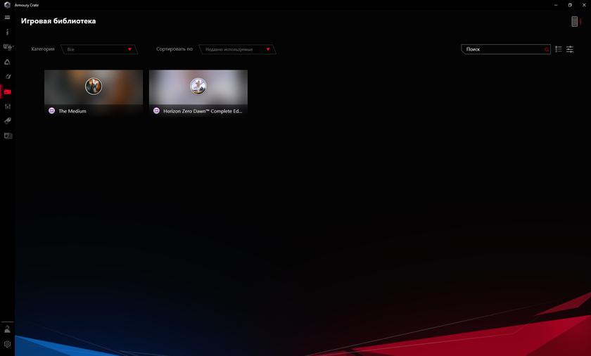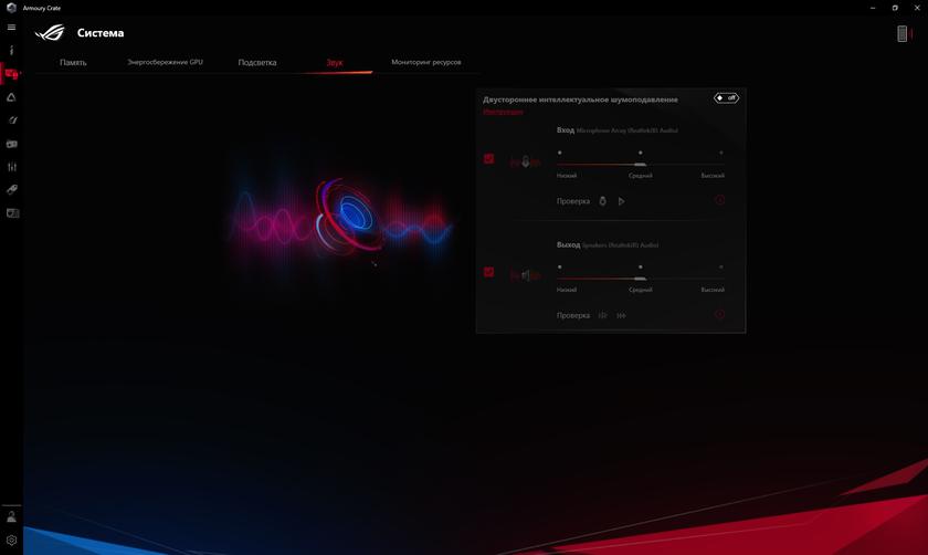 Для связи с внешним миром предусмотрен двухдиапазонный Wi-Fi (с поддержкой Wi-Fi 6) и Bluetooth 5.0. А при наличии ROG XG Mobile можно подключиться и с помощью кабеля, есть Gigabit Ethernet. Аудиосистема представлена двумя динамиками мощностью 1 Вт каждый. Чудес ждать не стоит, но звучит вполне толково, учитывая форм-фактор. Для настройки ноутбука используется приложение Armoury Crate. В нём можно выбирать режимы работы ноутбука, мониторить состояние системы, проверять наличие обновлений (как и в приложении MyASUS, которое тоже установлено), делать профили с различными настройками для разных приложений, игр и так далее.