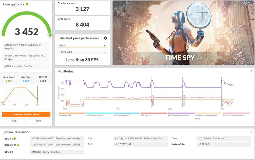 Без внешней видеокарты, на GTX 1650 Max-Q придётся настройки графики убавить до стредних/низких, чтобы получить играбельный фреймрейт. Cyberpunk 2077 на средних настройках без трассировки лучей — от 25 до 32 FPS. Hitman 3 — 38-55 FPS. А в HZD можно получить чуть более 60 FPS на низких настройках графики.