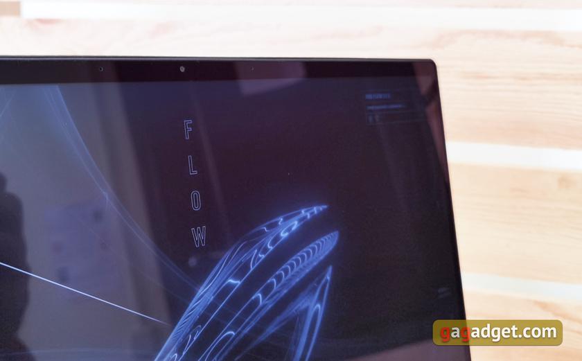 Рамки по периметру дисплея довольно тонкие, ощутимо шире только "подбородок" с надписью ROG Flow. HD веб-камера с микрофонами размещена на привычном месте. А всё это закрыто стеклом Gorilla.