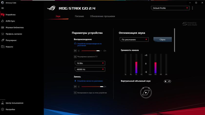Для настройки используется общее для всей игровой периферии производителя ПО Armoury Crate. Помимо очевидных громкости и эквалайзера есть ещё ряд дополнительных. Включая виртуальный звук 7.1, настройка шумодава, компрессия, усиление басов, голоса и даже реверберация. К слову, при первом включении по умолчанию были включены и виртуальный 7.1, и реверб, и какой-то пресет эквалайзера. Соответственно звук... Скажем так, несколько озадачил. Но всё вернулось в норму после отключения этих всех примочек. В отдельной вкладке отображается заряд аккумулятора и время перехода в спящий режим. Последняя вкладка отвечает за обновление ПО.