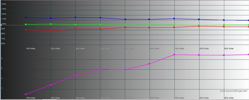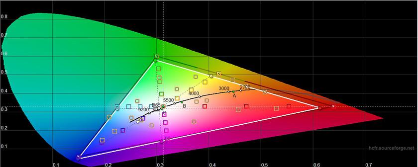 Замеры колориметром производились в режиме Default с активированным Overdrive. Максимальная яркость — 255.729 кд/м2, яркость черного поля — 0.323 кд/м2 и контрастность 792:1. Запас яркости небольшой, но для игрового ноутбука вполне достаточно. Откалиброван экран очень толково, самую малость уходит в холодные оттенки (что можно откорректировать при желании), цветовой охват близок к sRGB: