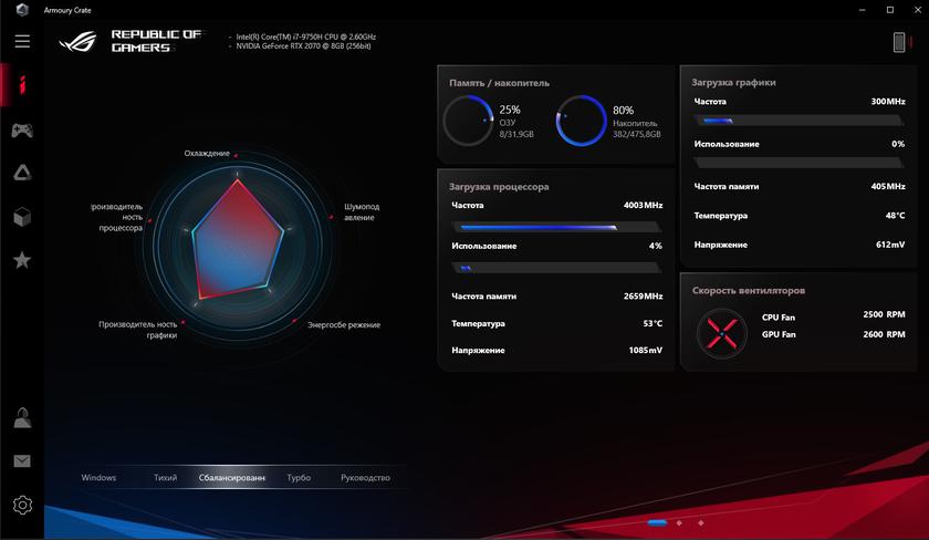 Помимо ROG Game Visual в ноутбуке установлено фирменное приложение Armoury Crate, в котором производится вся настройка ноутбука, включая режимы работы, подсветку и обновления. Там же есть своеобразный хаб с рекомендуемыми приложениями: