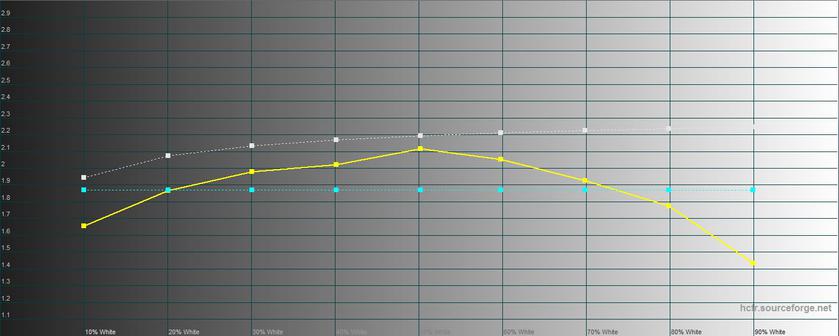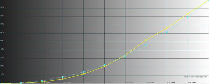 Самая странная настройка картинки оказалась в режиме Cinema. Экран очень "синит": большой переизбыток синей составляющей и недостаток красной: цветовая температура колеблется в районе 10000К (при эталонных 6500К). В этом режиме максимальная яркость составила 372.53 кд/м², а статическая контрастность — 715:1.
