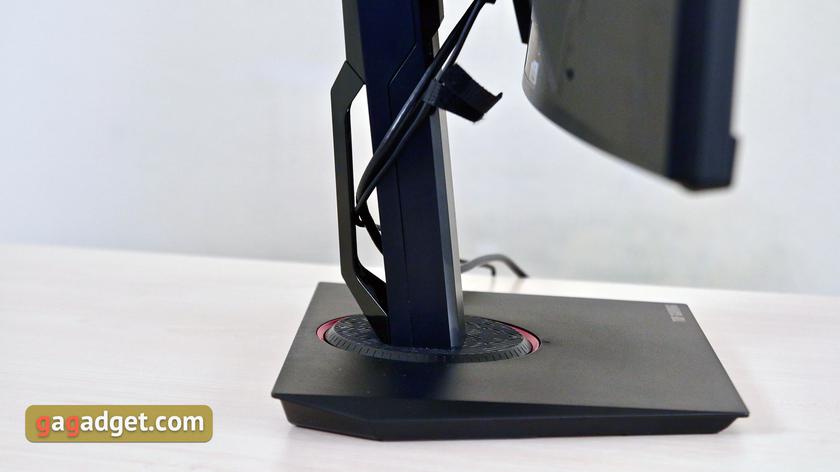 Подставка массивная, трапециевидной формы. У неё металлическое основание (для большего веса и устойчивости), а снаружи — матовый чёрный пластик. Спереди — небольшой логотип линейки TUF Gaming, а посередине — круглое прокручивающееся основание стойки с замысловатым узором. По периметру — красное окаймление и насечки. Также есть одна насечка посередине подставки перед основанием. Такое впечатление, что это сделано для самых идейных перфекционистов, которые хотят поставить монитор идеально ровно: