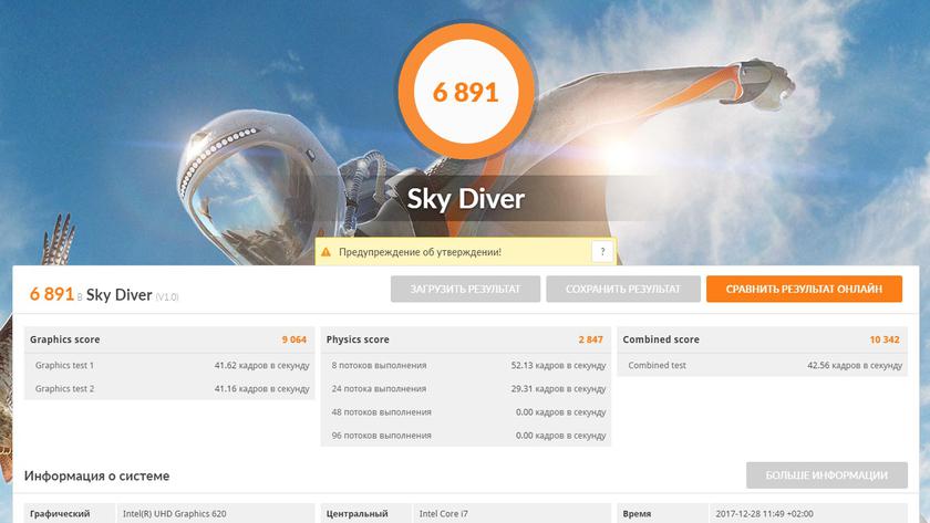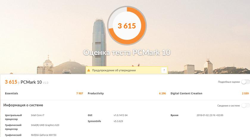 Для того, чтобы объективно сравнивать i7-7500U и i7-8550U нужно иметь прочие равные, что в данном случае сложно. Тем более, что тесты Futuremark видеокарту GeForce MX150 и вовсе не распознали. Если сравнивать результаты с одним из прошлых ZenBook на i7-7500U, но с 16 ГБ ОЗУ и без дискретной графики, то свежий ZenBook 13 демонстрирует ожидаемо более высокие результаты. Хотя, как я и сказал, сравнение не совсем уместно: