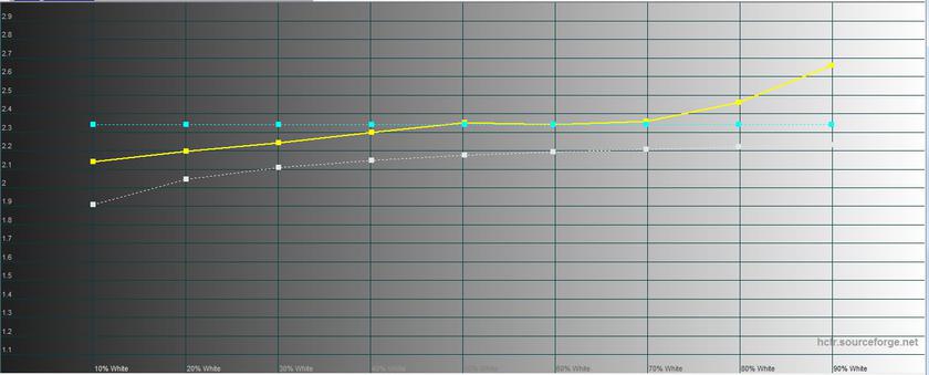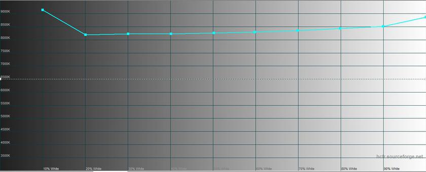 Замеры с помощью колориметра мы, безусловно сделали, но в данном случае они несут скорее формальный характер: во-первых, у нас побывал инженерный сэмпл, а во-вторых, я уверен, что показания конфигураций для нашего рынка будут отличаться от сенсорной версии. Максимальная яркость составляет 264.821 кд/м2. Яркость черного поля — 0.407 кд/м2, а контрастность — 651:1. Калибровка неплохая: имеется небольшой недостаток красного и более ощутимый переизбыток синего, цветовая температура колеблется в пределах от 8000K до 9000K: