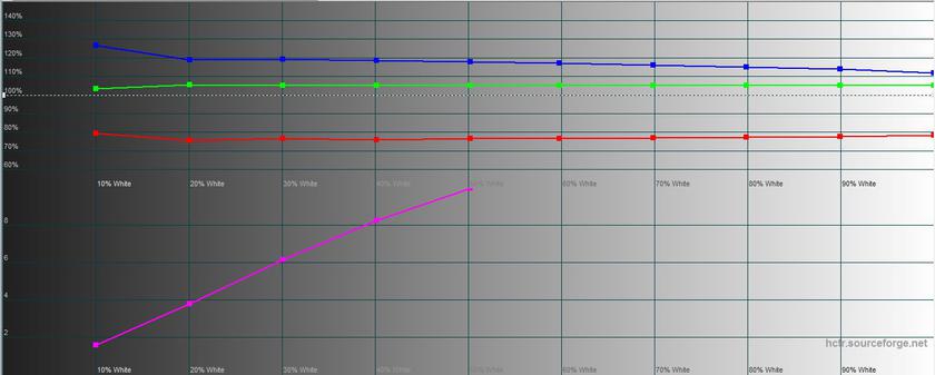 По результатам замеров, максимальная яркость дисплея составила 268.823 кд/м2. Яркость черного поля — 0.249 кд/м2, а статическая контрастность — 1080:1. Экран очень неплохо откалиброван, Gamma-кривая близка к эталонному показателю, есть небольшой недостаток красного и переизбыток синего, в результате картинка немного "холодновата". Но это можно подкорректировать в настройках. Цветовой охват близко к sRGB: