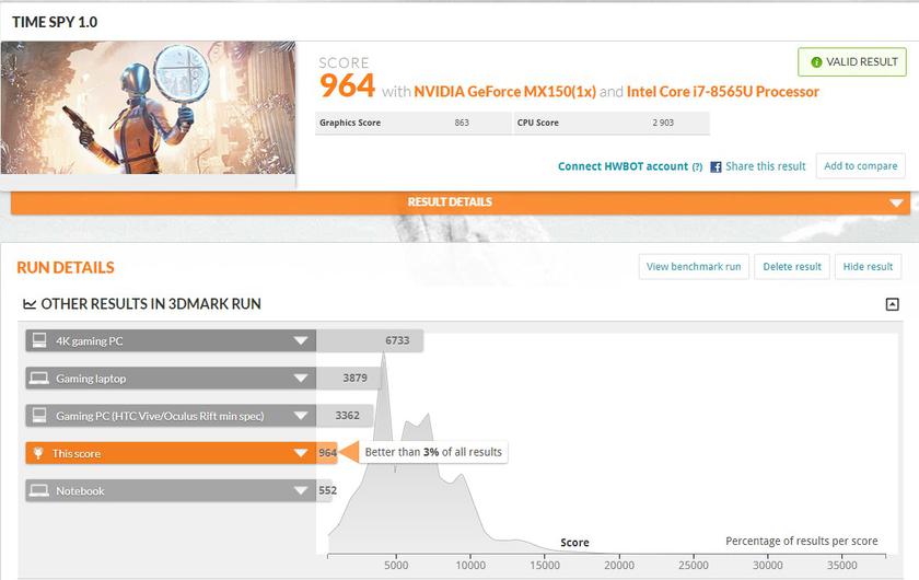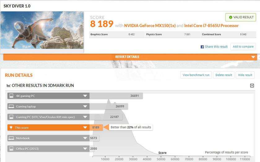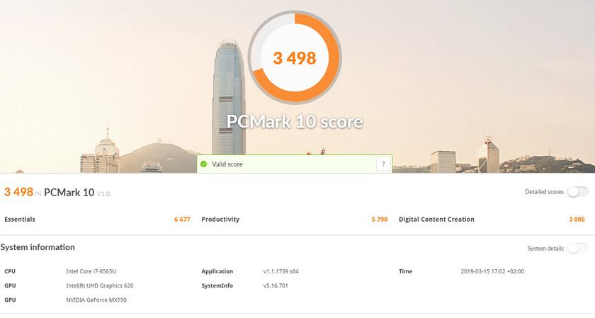 Результаты в тестах производительности весьма хороши, как для ультрапортативного ноутбука. Само собой, GeForce MX150 — не игровой видеоускоритель, но он всё-таки помощнее встроенной графики: