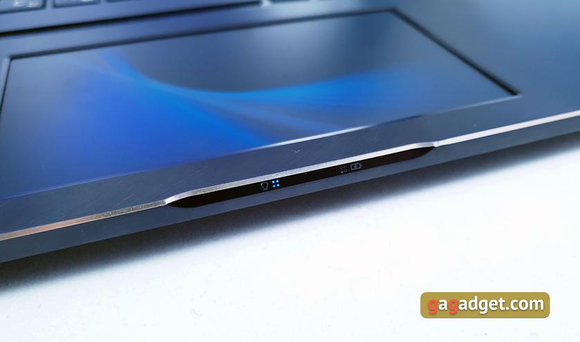 Размеры самой клавиатуры и раскладка не изменились с прошлого года: уменьшенный по высоте ряд F1-F12, длинные Shift, одноэтажный Enter. Кнопка питания расположена правом верхнем углу основного блока, отдельные кнопки Home, Pg Up, Pg Dn, End и ещё одна Fn крайним столбцом справа. Основная особенность в том, что теперь F1-F12 по умолчанию отвечают за дополнительные функции: яркость, громкость, режим работы ScreenPad и так далее. Если такой вариант не устраивает — можно легко переключиться к "классической" работе ряда F1-F12 с помощью комбинации Fn+Esc, либо с помощью предустановленной утилиты. Сканер отпечатков пальцев переместился вправо и расположился под краем клавиатуры. Работает он очень быстро и точно: