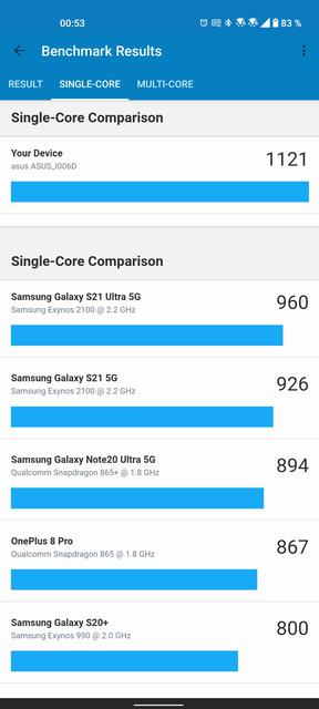 Внутри ASUS ZenFone 8 установлен один из самых мощных на данный момент процессоров. Флагманский Qualcomm Snapdragon 888. На всякий случай напомним его конфигурацию: 1хKryo 680 на 2.84 ГГц, 3хKryo 680 2.42 ГГц и 4хKryo 680 на 1.8 ГГц графический ускоритель Adreno 660. Доступны версии с 8/128 ГБ, 8/256 ГБ и 16/256 ГБ оперативной и встроенной памяти соответственно. У нас в редакции побывала топовая конфигурация. Используется быстрая оперативная память LPDDR5 и накопитель UFS 3.1. В синтетических тестах смартфон никаких неожиданностей: смартфон демонстрирует очень высокие результаты.