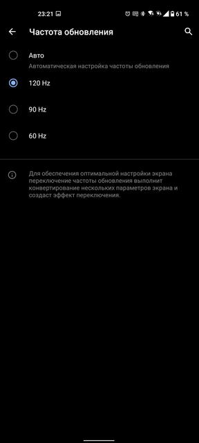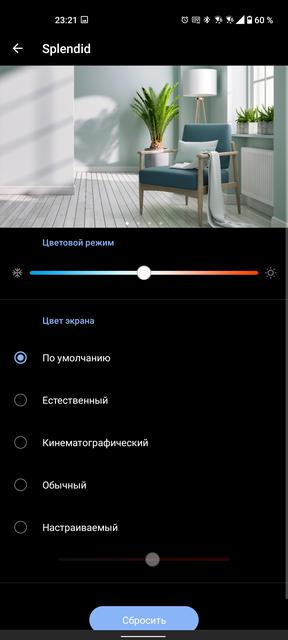 5.9-дюймовый экран ASUS ZenFone 8 имеет разрешение FullHD+ (2400х1080). Соотношение сторон — 20:9, а пиксельная плотность составляет около 449 ppi. Используется SuperAMOLED матрица производства Samsung с максимальной частотой обновления 120 Гц и временем отклика сенсора 1 мс. Есть поддержка стандартов HDR10 и HDR10+, пиковая яркость — 1100 кд/м2, а цветовой охват составляет 112% цветового пространства DCI-P3. В настройках есть всё необходимое: переключение частоты обновления (120, 90, 60 Гц или автоматический режим), тёмная тема, настройка масштаба элементов интерфейса, шрифта, Always on Display, цветовые режимы Splendid и DC Dimming (работает только при 60 Гц). Примечательно, что в смартфоне есть целый ряд режимов производительности. И в максимальном принудительно используется частота 120 Гц. Другие режимы становятся недоступны.