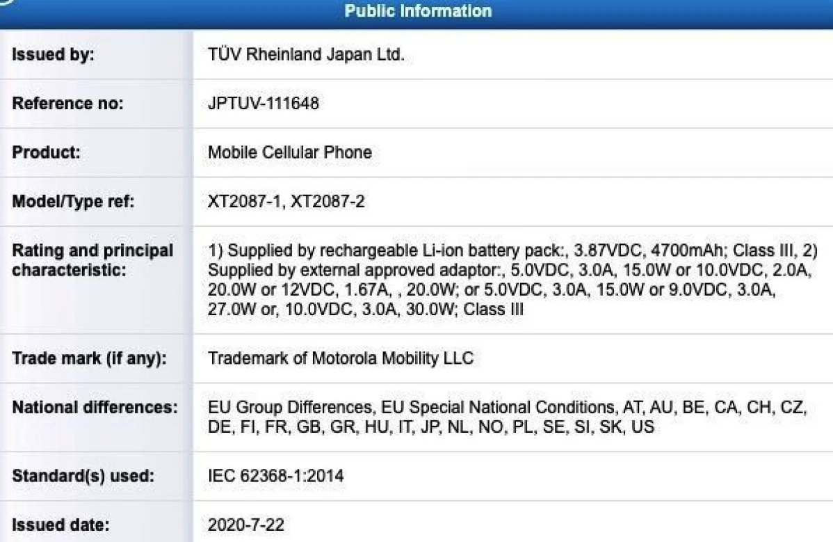 Motorola сертифицировала Moto G9 Plus в TUV Rheinland: смартфон получит батарею на 4700 мАч с быстрой зарядкой на 30 Вт