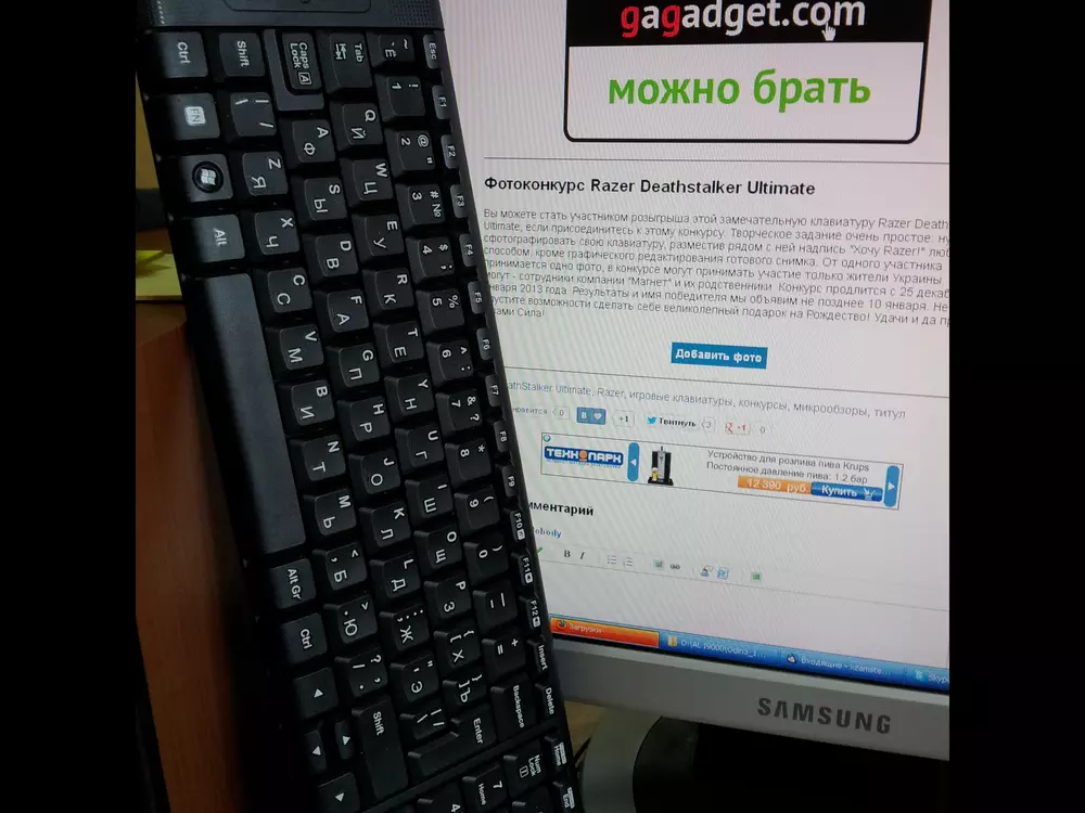 Вы можете стать участником розыгрыша этой замечательную клавиатуру Razer DeathStalker Ultimate, если присоединитесь к этому конкурсу. Творческое задание очень простое: нужно сфотографировать свою клавиатуру, разместив рядом с ней надпись "Хочу Razer!" любым способом, кроме графического редактирования готового снимка. От одного участника принимается одно фото, в конкурсе могут принимать участие только жители Украины. И не могут - сотрудники компании "Магнет" и их родственники. Конкурс продлится с 25 декабря по 7 января 2013 года. Результаты и имя победителя мы объявим не позднее 10 января. Не упустите возможности сделать себе великолепный подарок на Рождество! Удачи и да пребудет с вами Сила!
