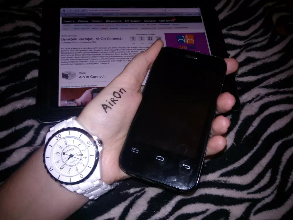 Вы можете выиграть часофон AirOn Connect. Для этого отправьте на конкурс фотографию, на которой должны быть изображены два предмета: часы и смартфон или мобильный телефон. В кадре обязательно должна присутствовать надпись «AirOn», выполненная от руки. Один участник может загрузить не более одной фотографии. Победитель будет выбран случайным образом среди всех участников, представивших соответствующие условиям конкурса работы. В конкурсе могут принимать участие только резиденты Украины, не являющиеся сотрудниками или родственниками сотрудников медиа-холдинга «Магнет». Конкурс проводится с 22 января по 5 февраля 2014 года включительно, итоги будут подведены не позднее 7 февраля.