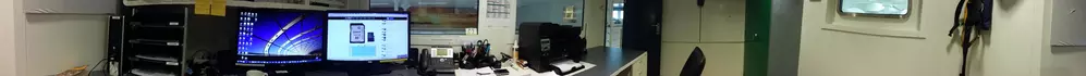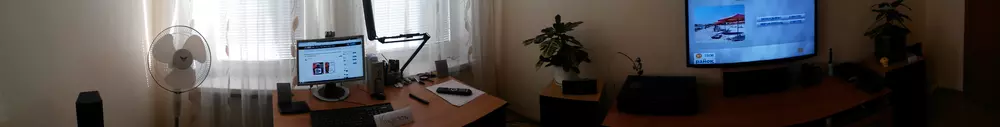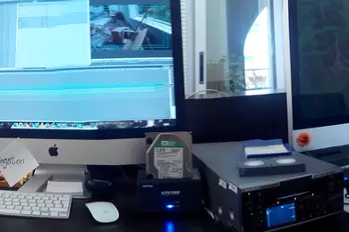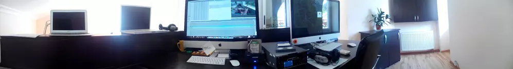 Собственно, на фото моё рабочее место, архивариуса одного из телеканалов. Можно увидеть используемое оборудование (несколько iMac, MacBook Air, Powerbook G4 (во время съёмки ушли в сон), устройство для оцифровки кассет), софт (Final Cut Pro) ну и по мелочи остального.