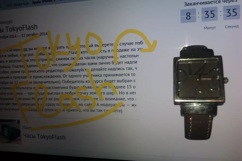 Впервые в истории gg вы можете выиграть приз, который выберете, в случае победы, сами. Призом этого конкурса являются любые, еще раз: любые часы TokyoFlash, которые есть в продаже на этом сайте. Для участия в конкурсе нужно сделать и загрузить на этой странице снимок любых часов (наручных, настольных, настенных, напольных и даже башенных). Подтверждением того, что снимок сделан вами лично будет надпись TokyoFlash в кадре сделанная любым способом, кроме графического редактора. Пожалуйста, делайте надпись так, чтобы у модераторов не возникало сомнений в природе ее происхождения. От одного участника принимается только одно фото. Конкурс проходит с 20 сентября по 12 октября (включительно). Победитель конкурса будет выбран в результате жеребьевки среди всех участников. Результаты и имя счастливчика будут объявлены не позднее 15 октября. В этом конкурсе нет ограничений на страну-участника — приз будет выслан в любую точку земного шара. Но в нем всё равно не могут принимать участие сотрудники компании Magnet и их родственники. Примите во внимание, что все поступившие на конкурс снимки проходят премодерацию и не сразу появляются на сайте. А модераторы — живые люди, а не роботы, работающие круглосуточно без выходных (хотя нам и приятно, что вы так считаете).