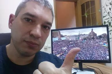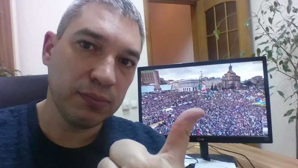 За спиной на мониторе знаменитое фото, сделанное 08 декабря 2013 года на Майдане Незалежності. По разным оценкам в тот день выразить свою гражданскую позицию пришло от 400 000 до 1 000 000 человек.