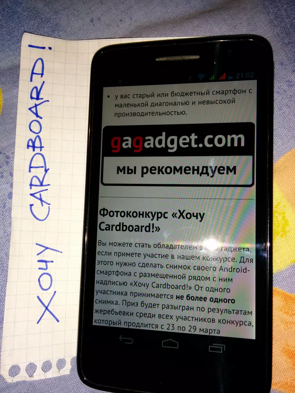 Вы можете стать обладателем этого гаджета, если примете участие в нашем конкурсе. Для этого нужно сделать снимок своего Android-смартфона с размещенной рядом с ним надписью «Хочу Cardboard!» От одного участника принимается не более одного снимка. Приз будет разыгран по результатам жеребьевки среди всех участников конкурса, который продлится с 23 по 29 марта (включительно). Результаты и имя счастливчика будут объявлены не позднее 3 апреля. В этом конкурсе, традиционно, могут принимать участие только жители Украины. И не могут — сотрудники компании Magnet и их родственники. Примите во внимание, что все поступившие на конкурс снимки проходят премодерацию и не сразу появляются на сайте. А модераторы — живые люди, а не роботы, работающие круглосуточно без выходных (хотя нам и приятно, что вы так считаете). Удачи и да пребудет с вами Сила!