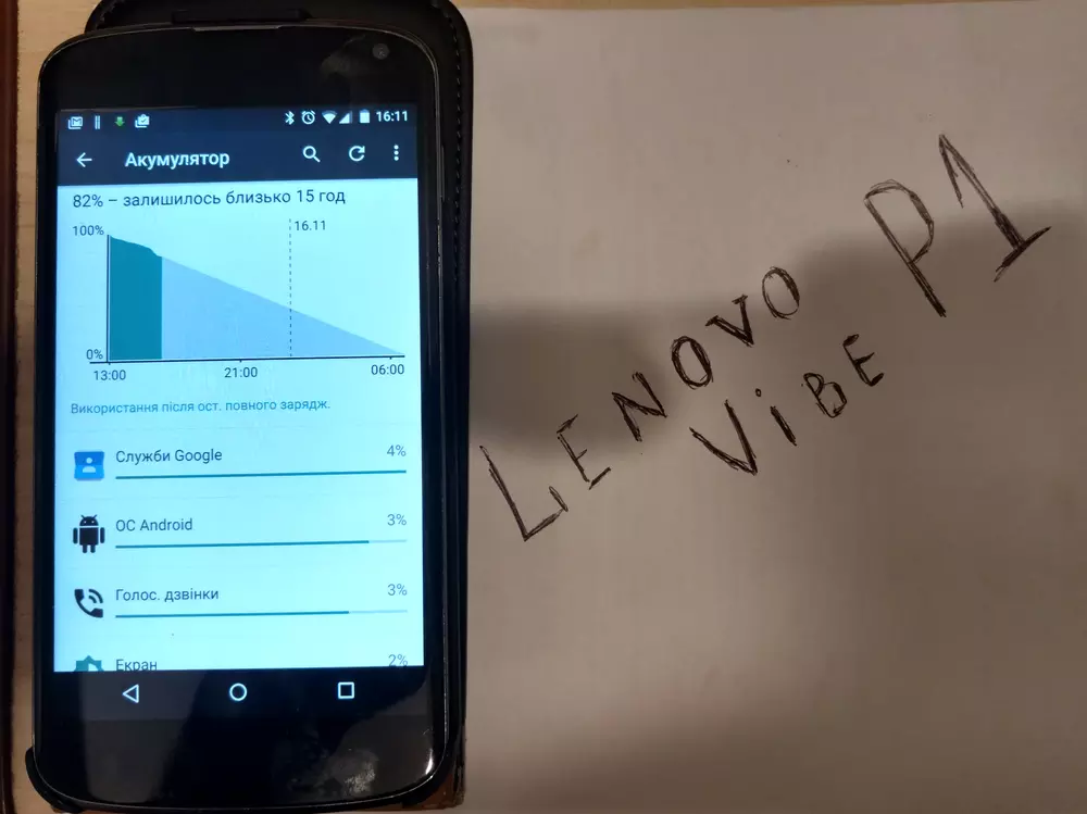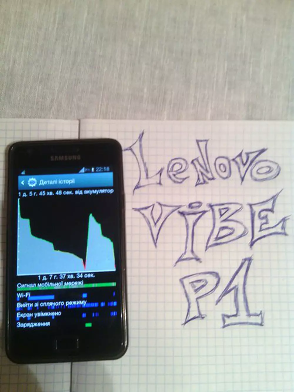 Уважаемые читатели! У вас есть возможность выиграть смартфон Lenovo Vibe P1, если вы примете участие в нашем конкурсе и сделаете снимок своего смартфона в режиме демонстрации графика разрядки аккумулятора вместе с надписью «Lenovo VIBE P1», сделанной любым удобным способом, кроме графического редактора — примеры таких снимков ниже.