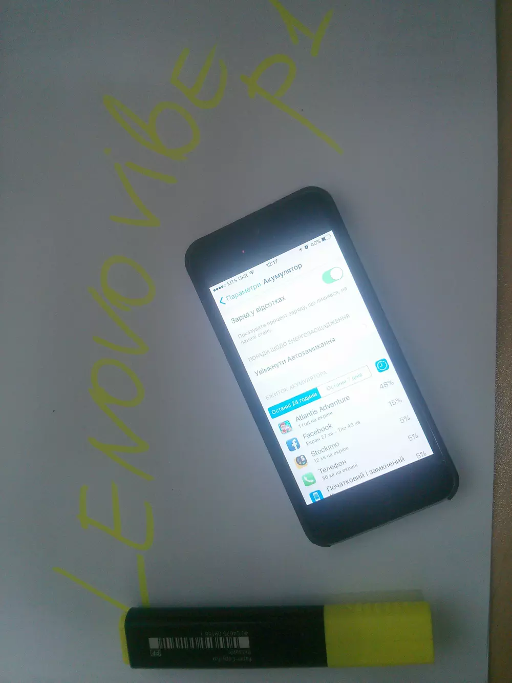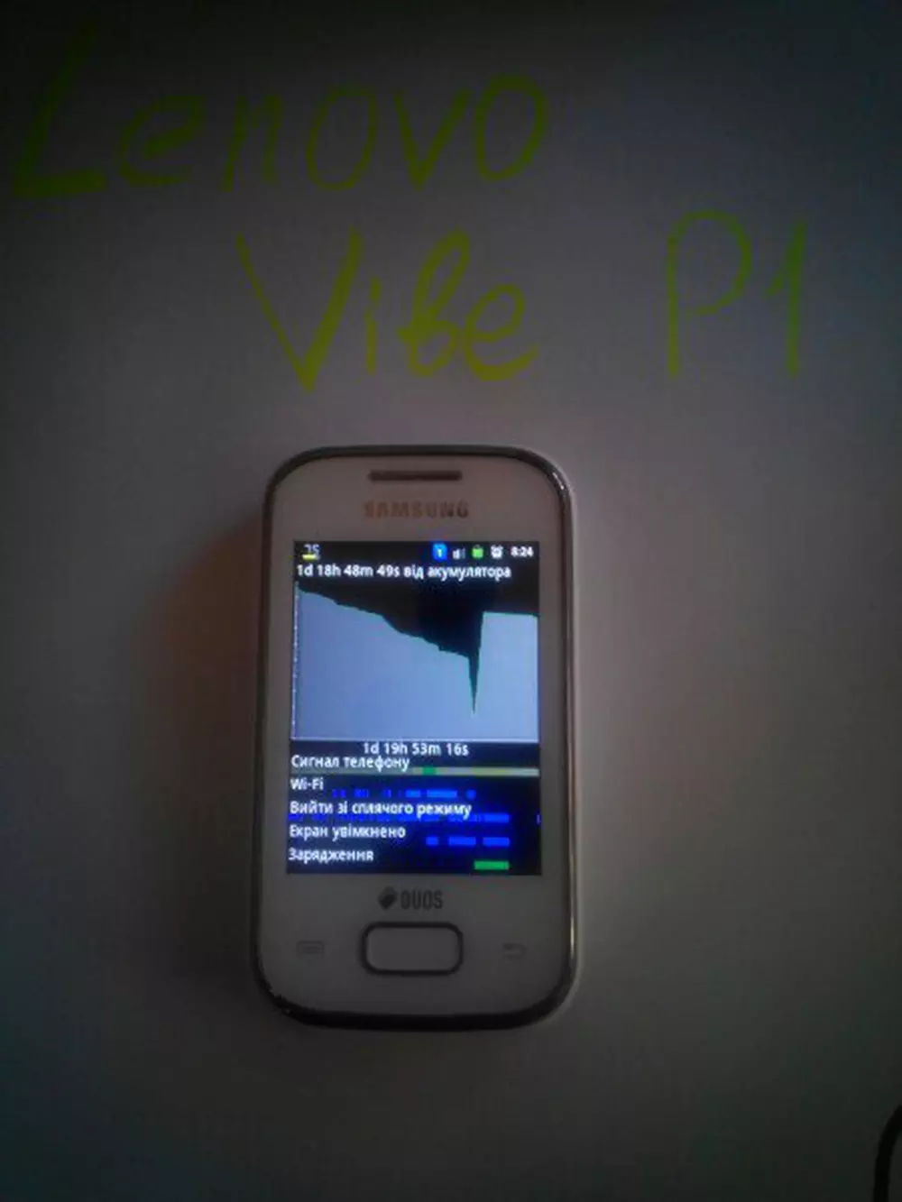 Уважаемые читатели! У вас есть возможность выиграть смартфон Lenovo Vibe P1, если вы примете участие в нашем конкурсе и сделаете снимок своего смартфона в режиме демонстрации графика разрядки аккумулятора вместе с надписью «Lenovo VIBE P1», сделанной любым удобным способом, кроме графического редактора — примеры таких снимков ниже.