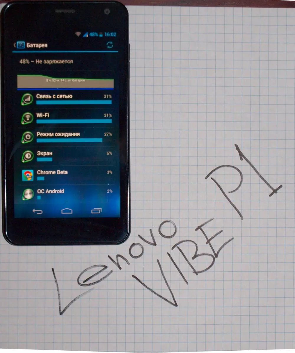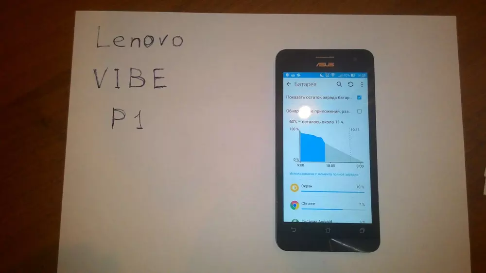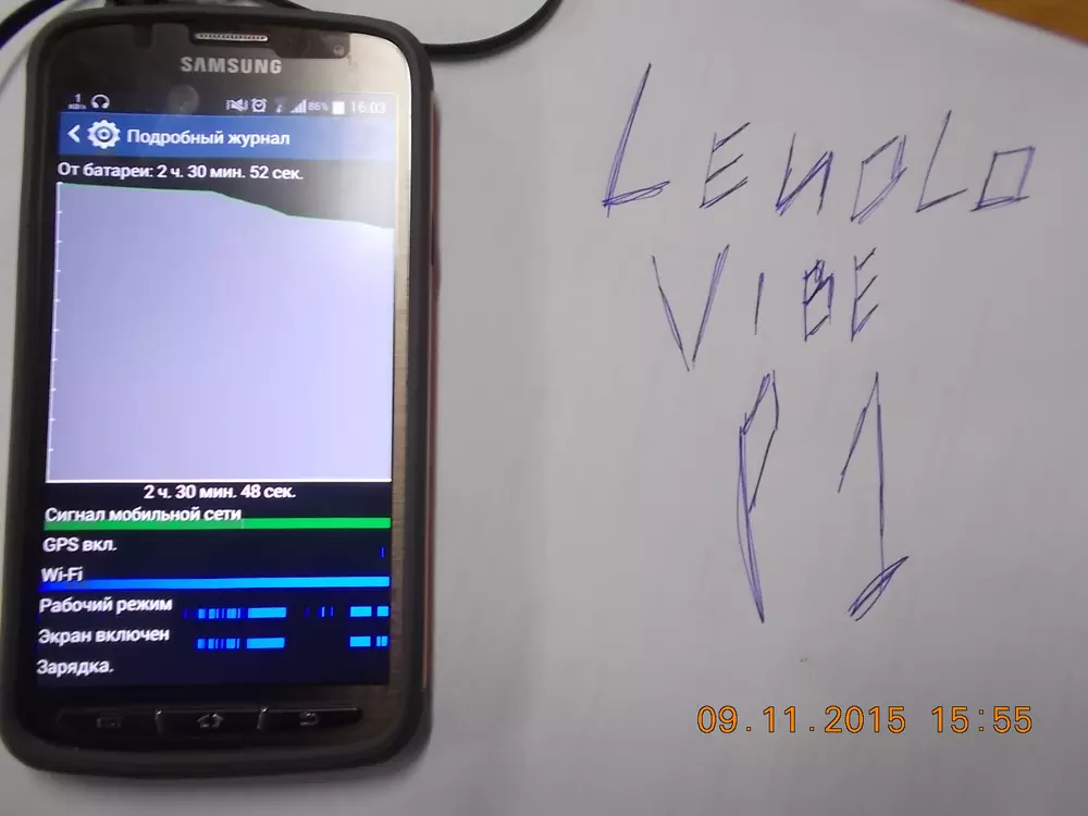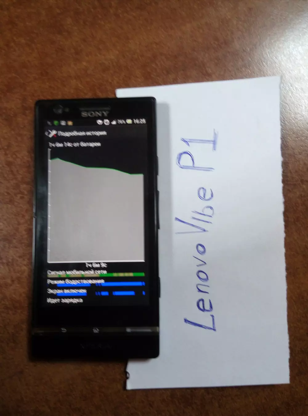 Уважаемые читатели! У вас есть возможность выиграть смартфон Lenovo Vibe P1, если вы примете участие в нашем конкурсе и сделаете снимок своего смартфона в режиме демонстрации графика разрядки аккумулятора вместе с надписью «Lenovo VIBE P1», сделанной любым удобным способом, кроме графического редактора — примеры таких снимков ниже.