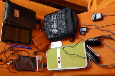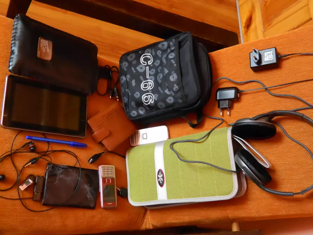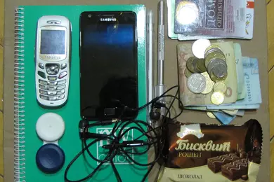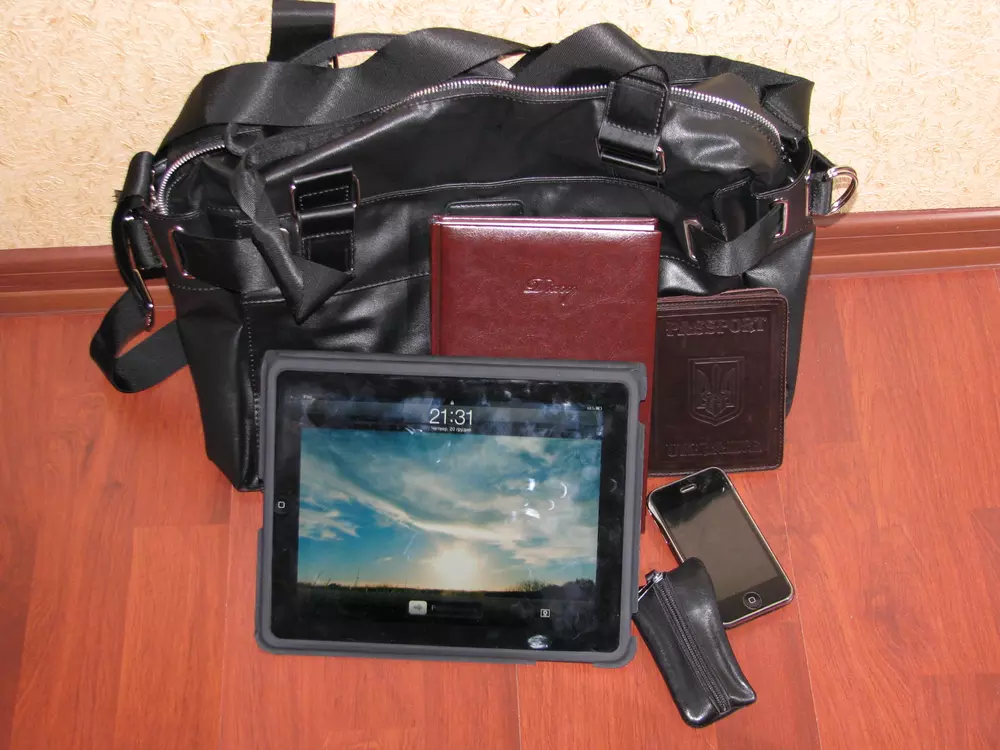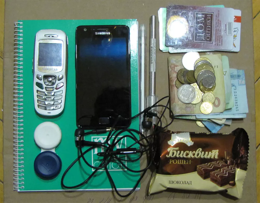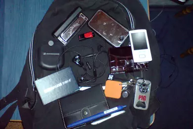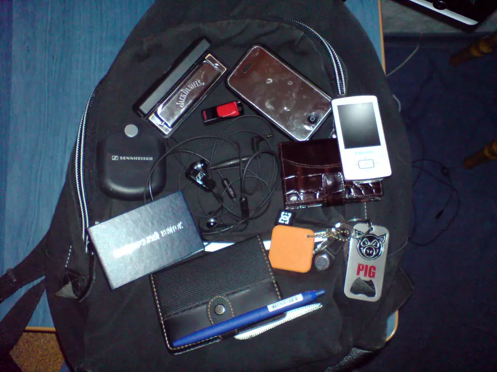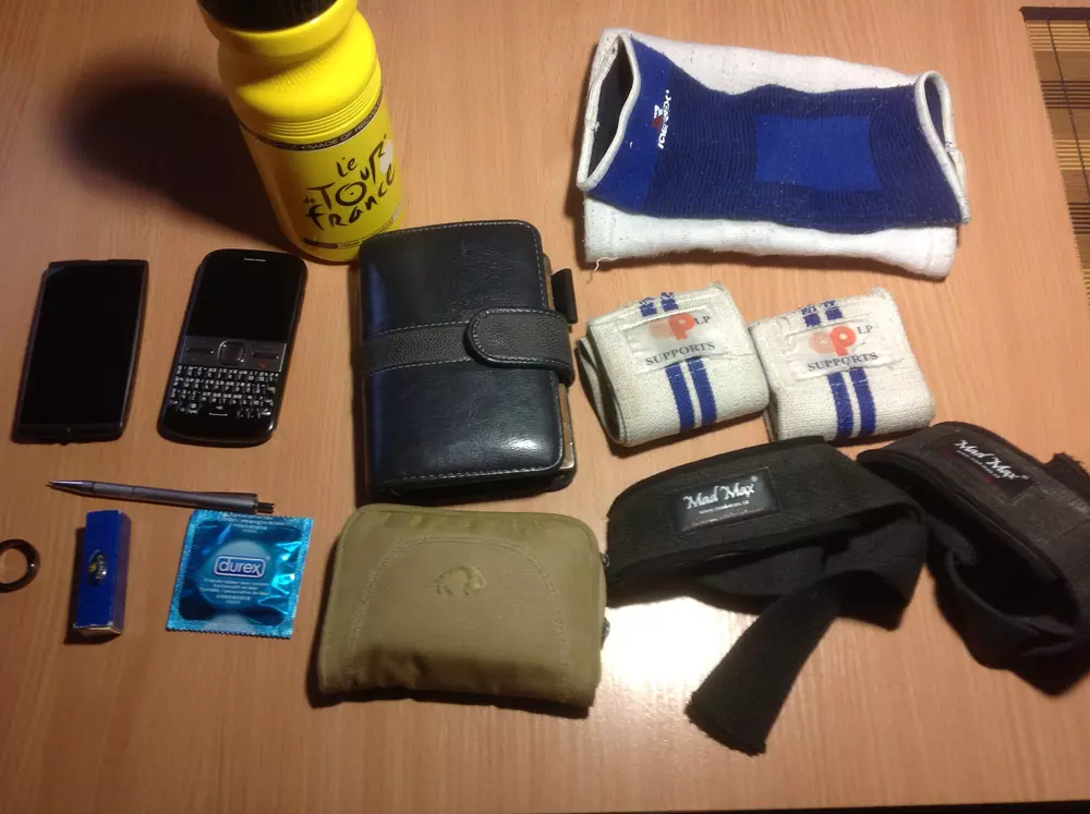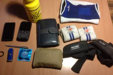 Поскольку я качок- борцуха:), обычно у меня всегда в рюкзаке валяются различные лямки, кистевые, коленные и голеностопные фиксаторы. Ну а также бутылка с водой, телефон и плеер cowon s9, бумажник и ежедневник, карандаш, спички, кольцо и "пасик для магнитофона":). В тренировочные дни добавляется одежда.