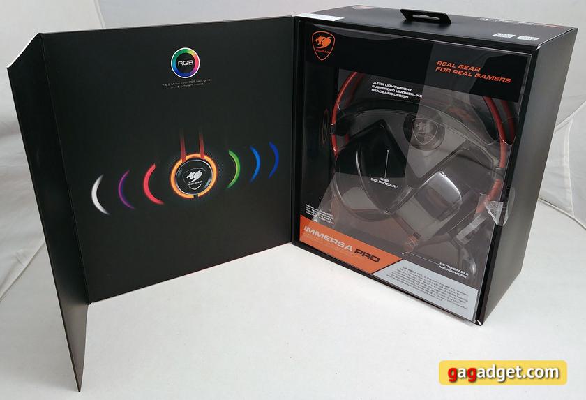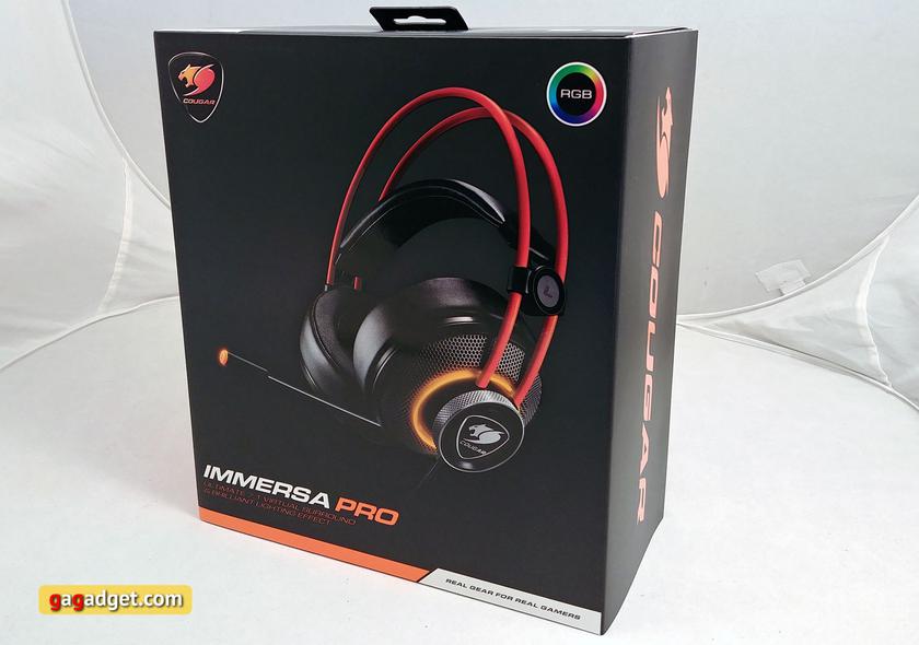 Cougar Immersa Pro поставляется в большой, красочной коробке, как и полагается игровому устройству. По всей площади упаковки — обилие изображений самой гарнитуры, основных её особенностей и технических характеристик. Передняя часть коробки откидная, так что можно посмотреть на гарнитуру не вскрывая упаковки: