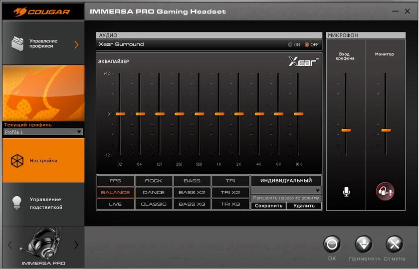 Фирменное ПО Cougar UIX достаточно лаконичное в плане настроек для Cougar Immersa Pro: есть возможность создавать различные профили для разных игр, а в основной части можно включить (или выключить) виртуальный звук Xear Surround, выбрать из кучи готовых пресетов эквалайзера для разных жанров игр или сделать свой собственный. Ниже — вкладка настройки подсветки: