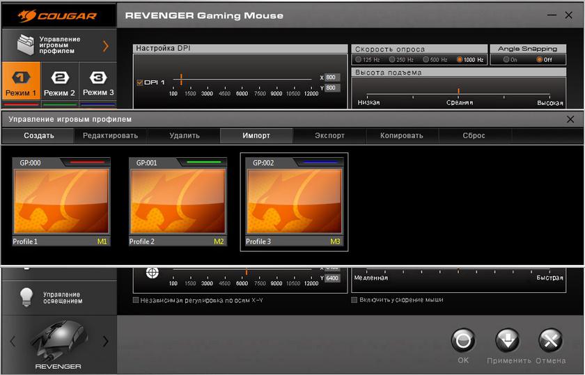 В Cougar Revenger установлен 32-битный ARM процессор и 512 КБ встроенной памяти для сохранения профилей и настроек. Для настройки используется фирменное ПО Cougar UIX. В левой его части есть вкладки для выбора нужного режима и профиля для последующей его настройки. Для режимов можно назначить отдельные цвета подсветки боковых светодиодов. Ниже — основные функциональные вкладки. Первая отвечает за производительность мышки, в ней можно настроить уровни DPI (в диапазоне от 100 до 12 000 DPI), в том числе можно отдельно настроить по осям X и Y. Ниже — уровень DPI Sniper Button (её нужно предварительно назначить). Далее — частота опроса, можно выбрать из четырёх значений: 125/250/500/1000 Гц. Рядом настраивается сглаживание лесенок Angle Snapping. Ниже — регулировка высоты отрыва от поверхности, скорость двойного нажатия, скорость прокрутки колеса и скорость указателя Windows: