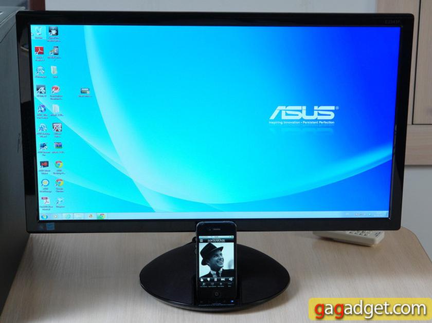 Итак, самое интересное. А именно — док-станция. Все продумано рационально. Помещаете iУстройство в разъем и устанавливаете в меню источником iPhone/iPod или же, если планируете параллельно работать на компьютере, комбинированный вариант (iPhone/iPod+VGA, iPhone/iPod+HDMI) — и все. Теперь можно смотреть видео, расположенное в смартфоне или плеере, на 23-дюймовом мониторе. А еще — слушать музыку через колонки монитора. А еще — синхронизировать с iTunes. Во время нашего недолгого тестирования почему-то не удалось провести синхронизацию: установленный на ПК iTunes в упор отказывался опознавать iPhone в док-станции. Зато аудио/видео проигрывалось без проблем. Что особенно приятно, iPhone и iPod, находясь в доке, постепенно заряжались.
