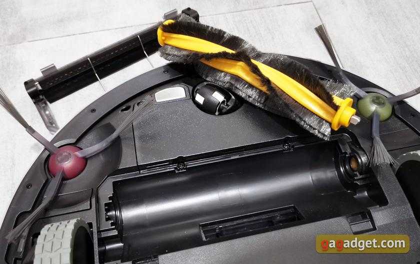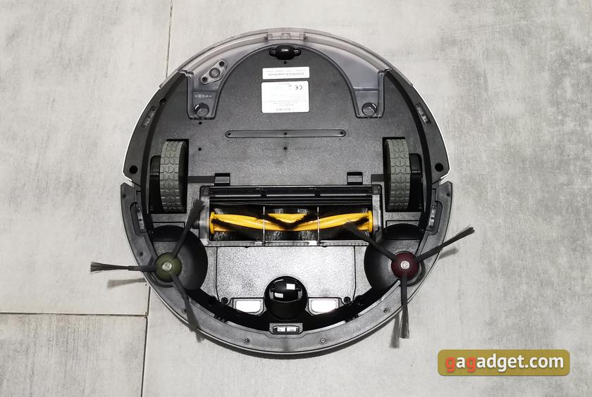 На нижней части робота много интересного. По бокам — два больших прорезиненных ведущих колеса, спереди — небольшое колесо с возможностью поворота на 360°. По бокам от него — контактные площадки для подзарядк. По периметру разместились пять датчиков для предотвращения падения со ступенек (один спереди и по два по бокам). В задней части робота — площадка для крепления ткани для влажной уборки. Практически посередине — отверстие для всасывания и сменная основная щётка.