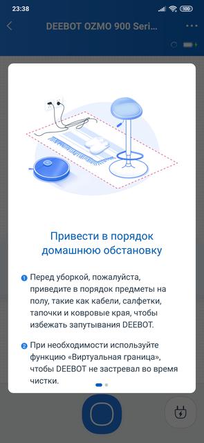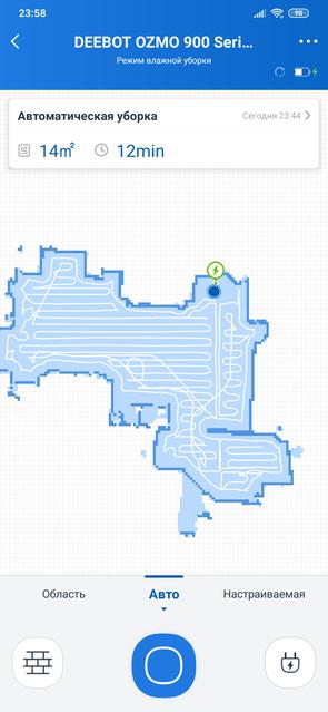 Перед первой уборкой приложение покажет вам рекомендации по предварительной подготовке помещения. Они стандартны для всех роботов-пылесосов: убрать провода, разбросанные носки и прочую мелочь с пола, задвинуть стулья и прочие мелочи. Во время первой уборки Ecovacs DEEBOT OZMO 900 будет "сканировать" своим лазерным дальномером убираемое помещение и делать его виртуальную карту. Из-за этого первая уборка может чуть затянуться: роботу нужно "освоиться" на новой территории. При последующих запусках он уже будет знать что делать и процесс будет происходить быстрее. В автоматическом режиме пылесос сначала делает "обход" по периметру зоны, после чего по S-образной траектории убирает внутри. Затем переходит к следующей зоне (комнате). Благодаря построению карты Smart Navi 3.0, Ecovacs DEEBOT OZMO 900 справляется с уборкой, да и находит зарядную базу значительно быстрее, чем модели без этой функции.