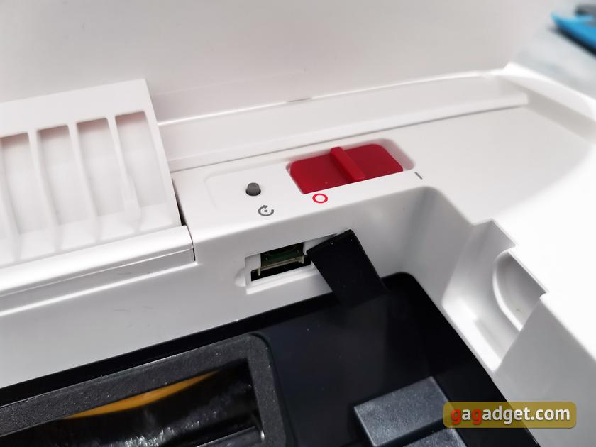 Верхняя крышка приподнимается. Под ней — ползунок питания, маленькая кнопка сброса (она же пригодится для первого подключения к беспроводной сети), сервисный разъём и, непосредственно, пластиковый пылесборник.